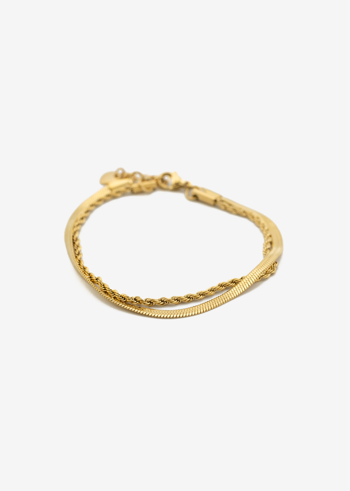 Deze dubbele armband is een echte eyecatcher! De combinatie van de twee gouden kettingen, één glad en één gedraaid, geeft de armband een unieke en trendy look.