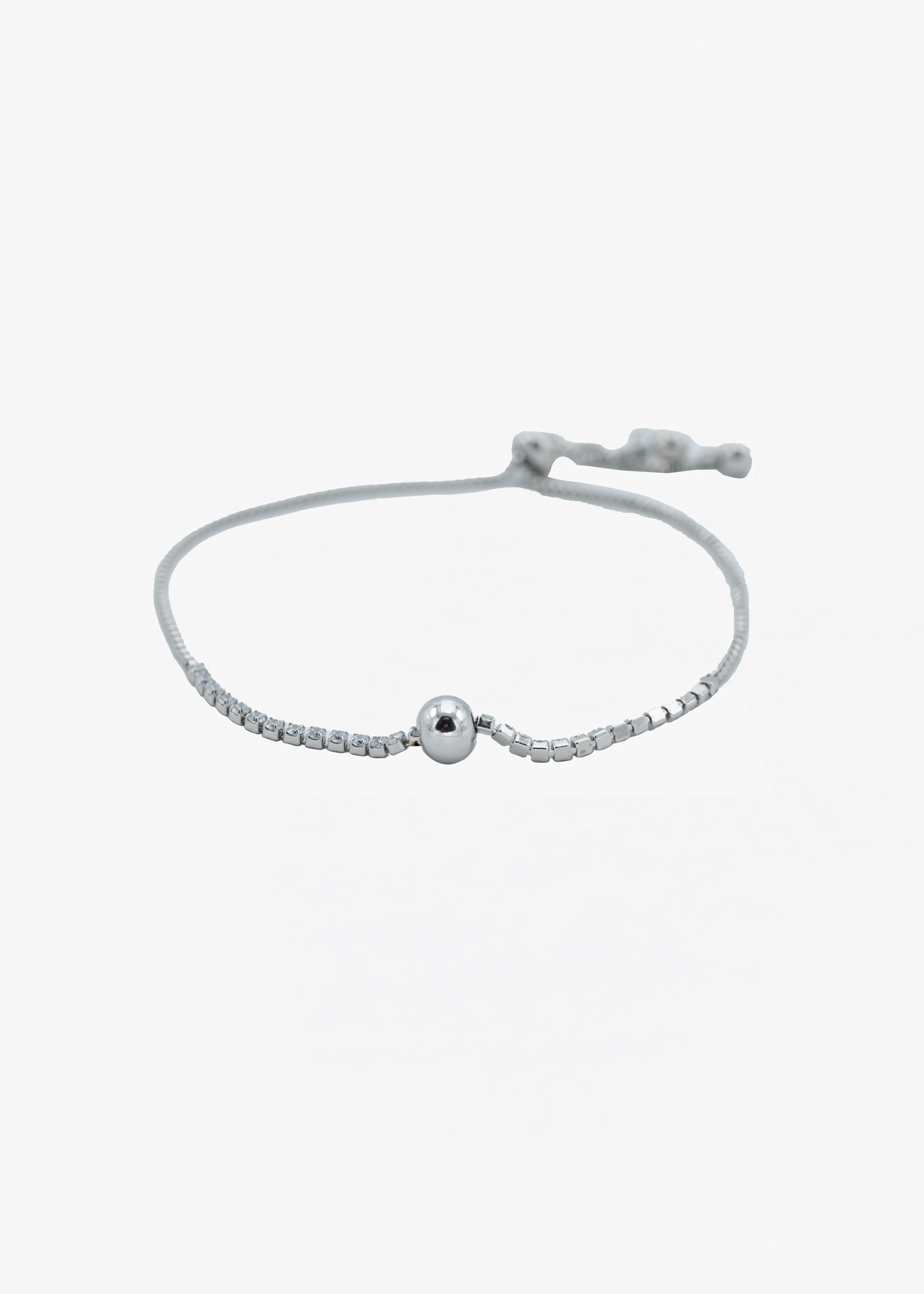 Deze delicate armband is de perfecte manier om je polsen te laten stralen! Subtiele glitter steentjes worden afgewisseld met een schattig balletje voor een speelse, maar elegante look.