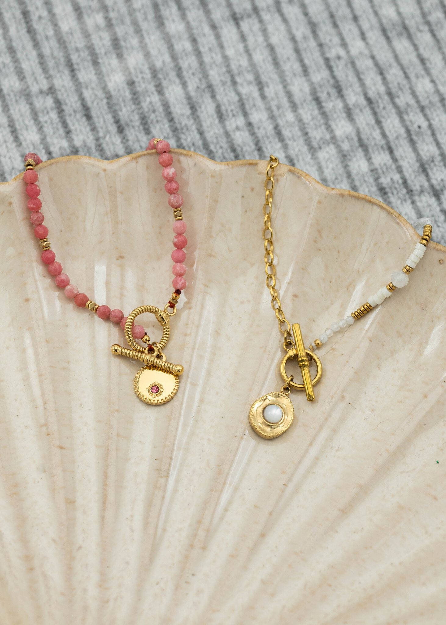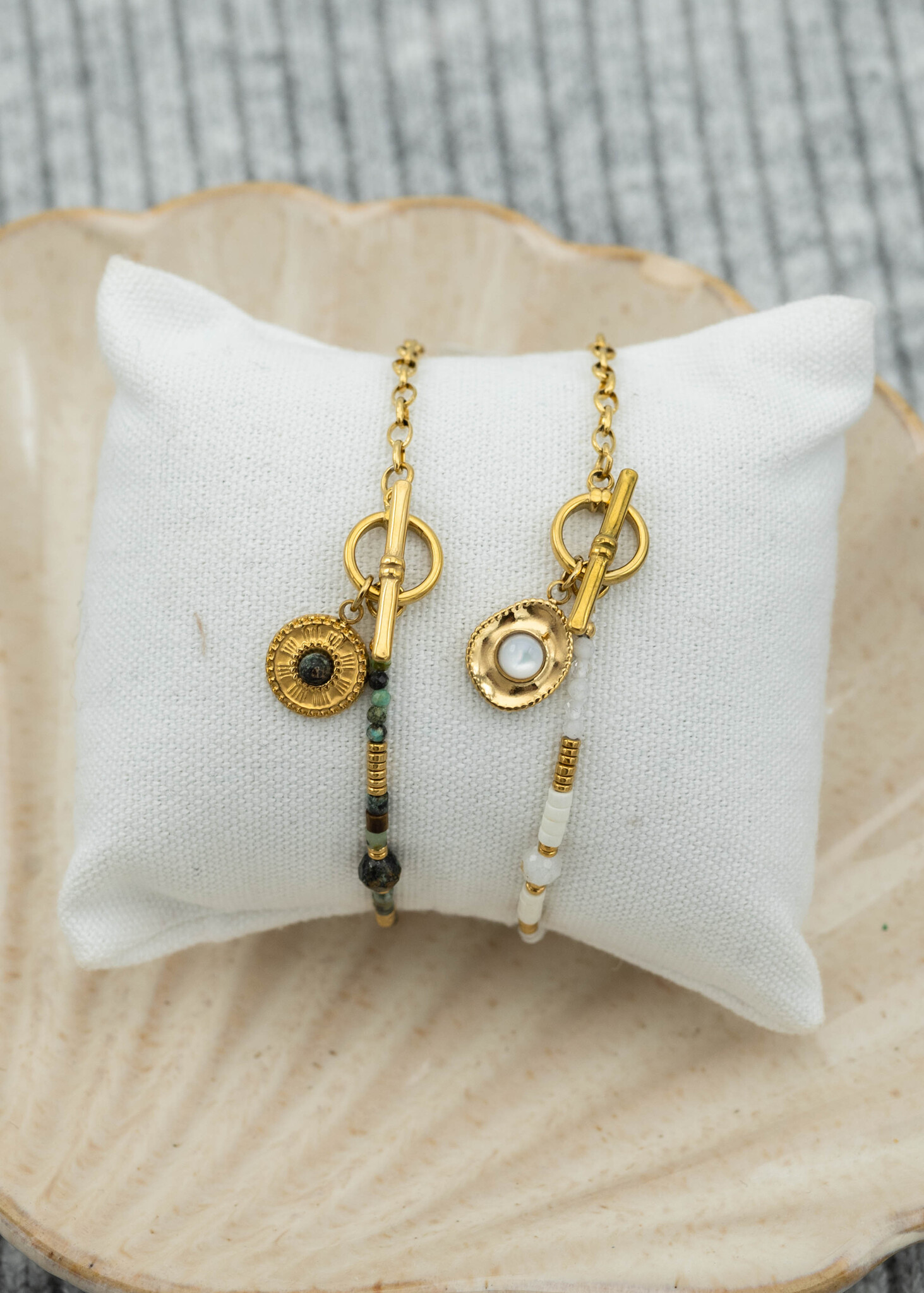 Op zoek naar een subtiele eyecatcher voor je pols? Deze prachtige armband met witte kralen is precies wat je nodig hebt! De combinatie van de goudkleurige details en de glinsterende, witte kralen geeft de armband een elegante en zomerse look.