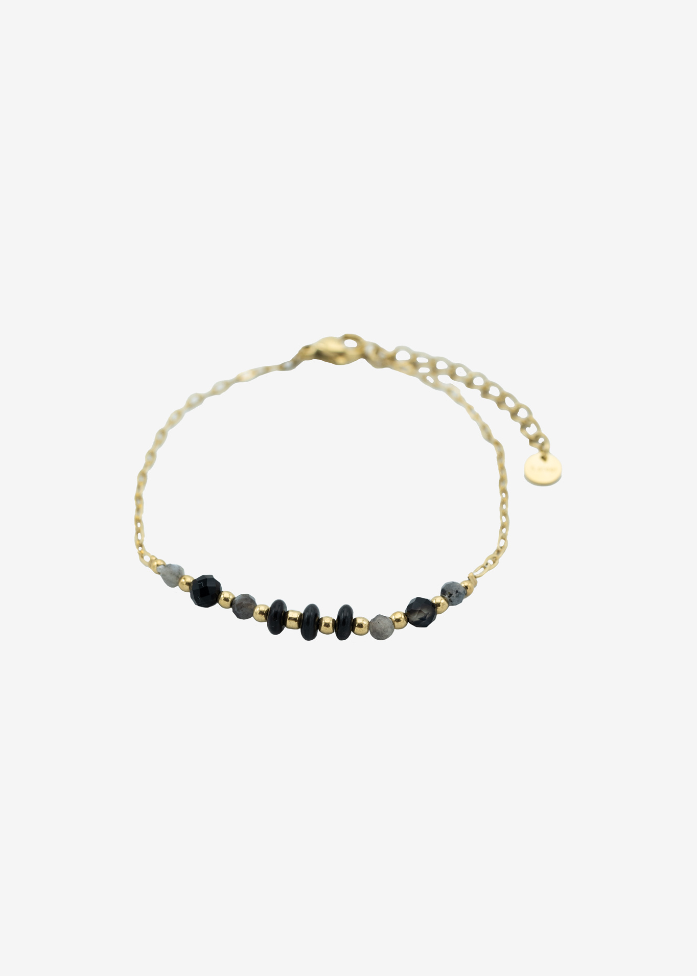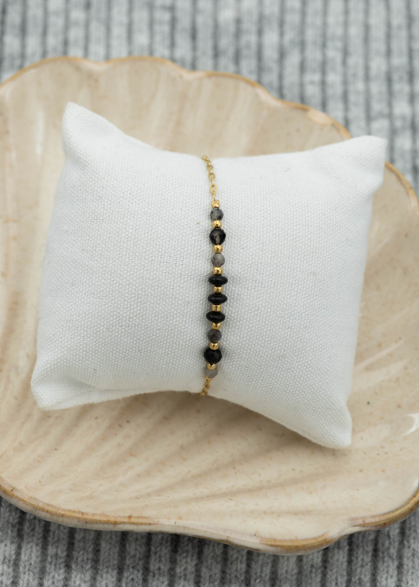 Deze elegante armband met zwarte kralen is een echte eyecatcher! De combinatie van de glinsterende gouden details en de stoere zwarte kralen geeft deze armband een unieke uitstraling.