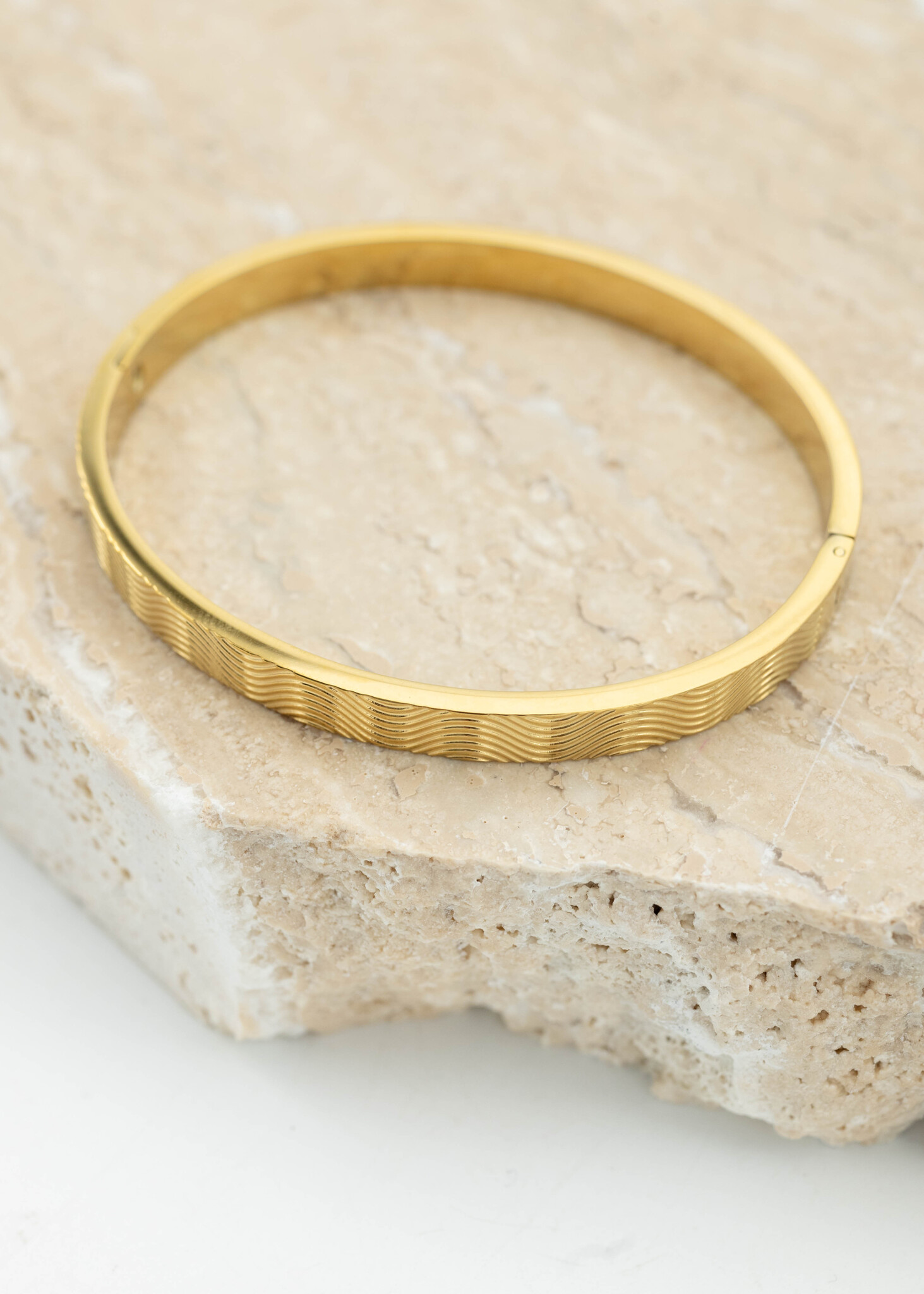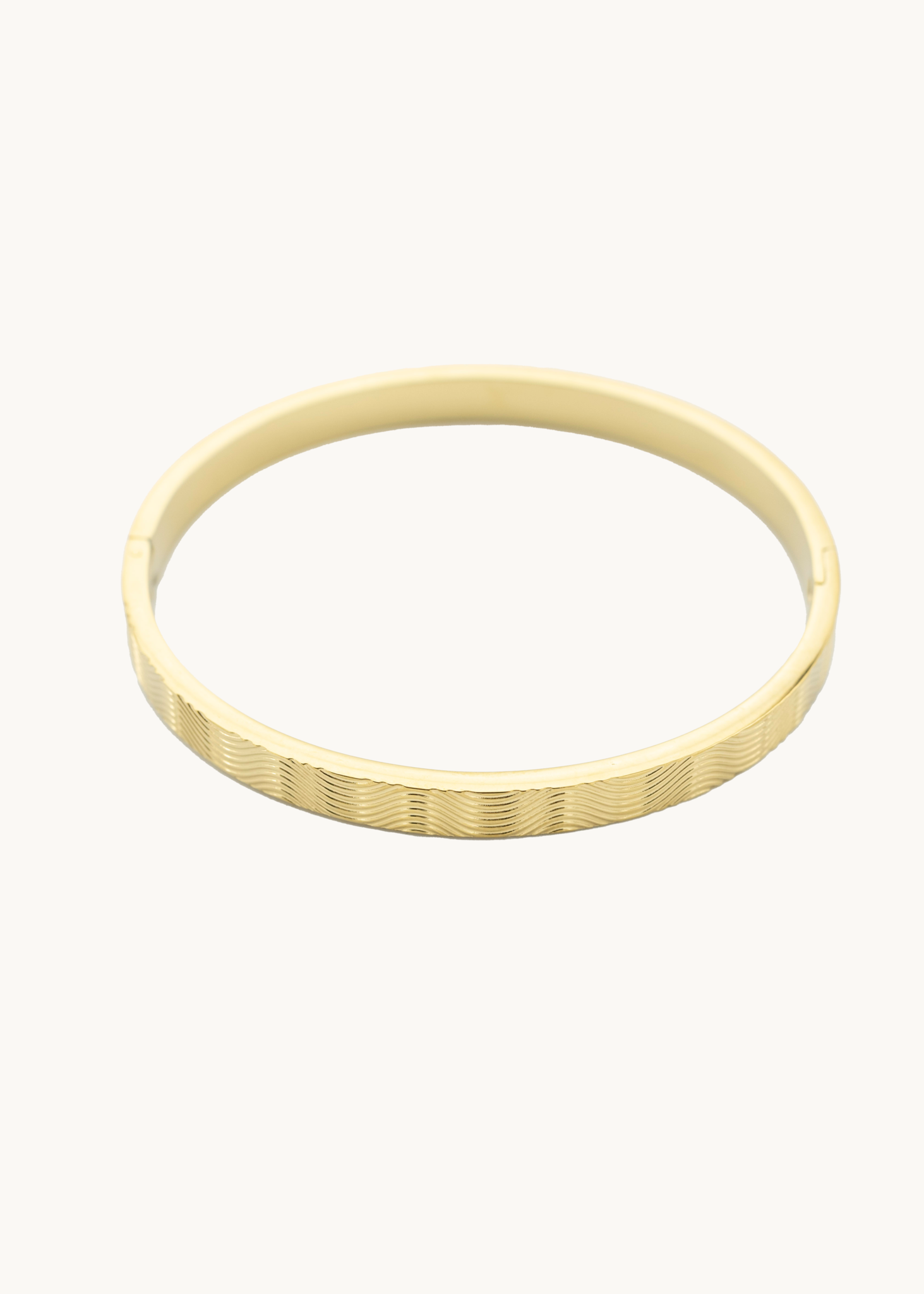 Draag deze gouden bangle met strepen naar een feestje voor een elegante look, of combineer hem met je dagelijkse outfit voor een vleugje glamour.