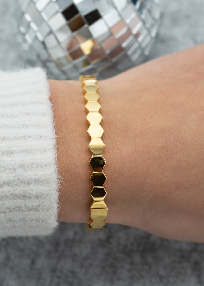 Op zoek naar een bangle die net even anders is? Deze gouden bangle armband is een echte eyecatcher! Het unieke zigzagpatroon geeft 'm een speelse touch, terwijl de gouden kleur zorgt voor een vleugje luxe.