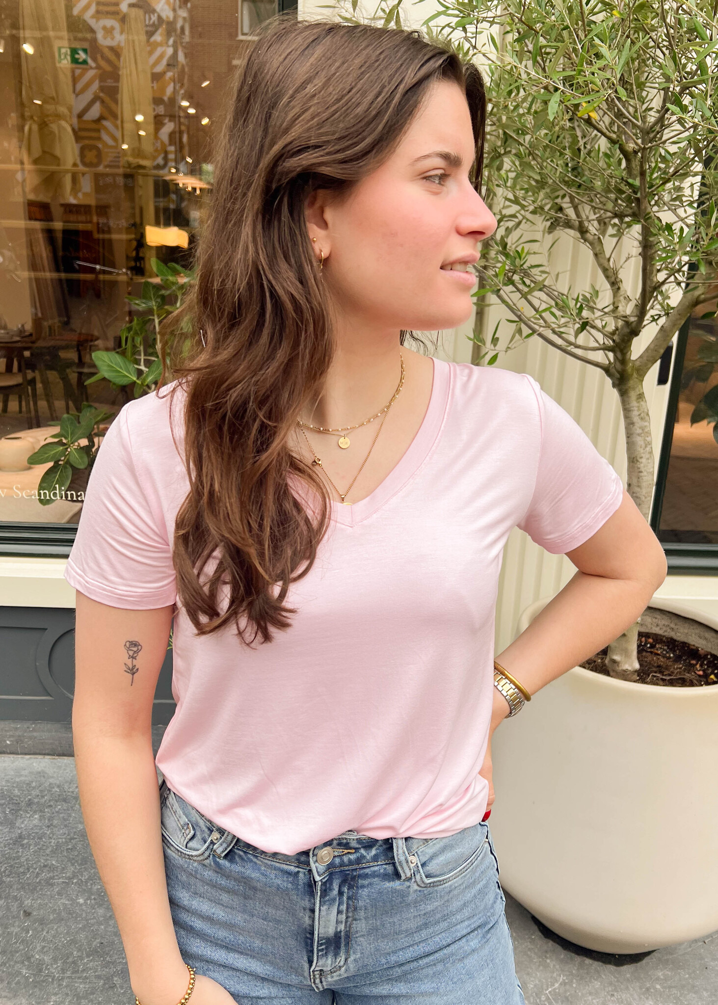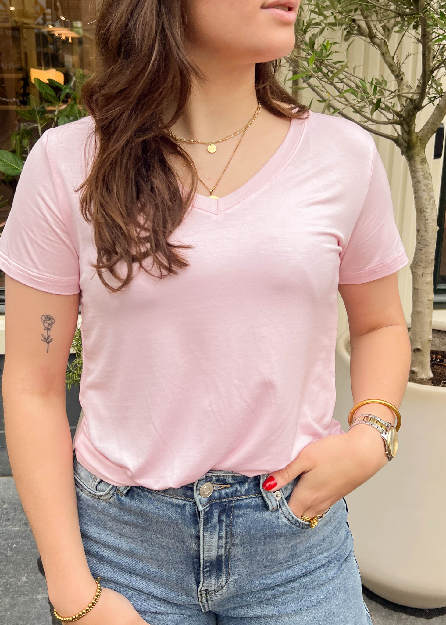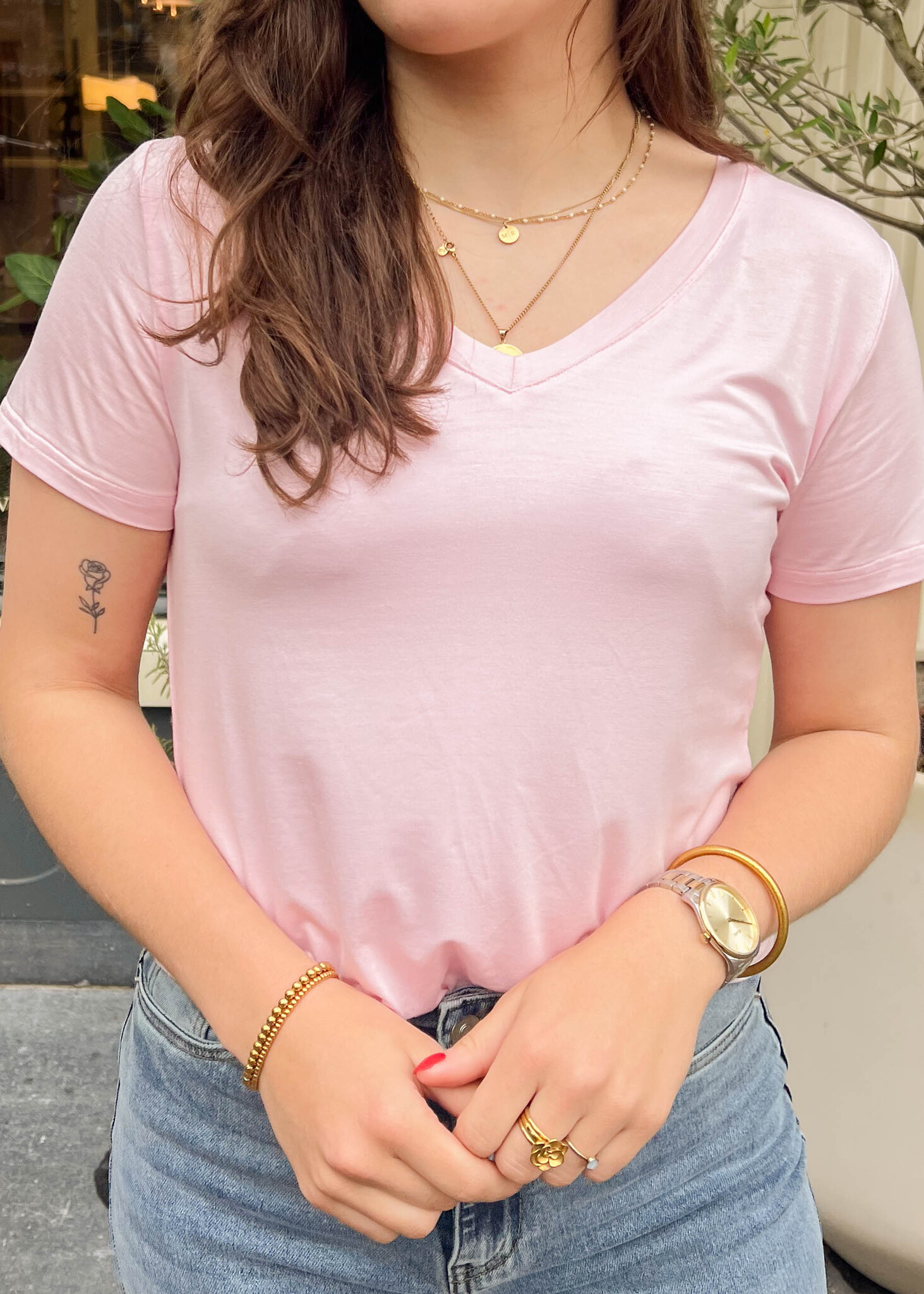 Aan verlanglijst toevoegenBasic shirt Kylie zachtroze✨ 4.8 / 5 score via Google Reviews 19,99 Incl. btw Op voorraad Maat S/M M/LSize: *S/MM/LIn winkelmandjeInloggen voor wishlistVoor 15:00 besteldvandaag verzondenAchteraf betalenvia Klarna, binnen 14 dagenGratis verzendingvanaf €75Veilig betalenmet beveiligde SSL verbindingBeschrijvingDit zacht roze shirt is een echte must-have! Het basic shirt met V-hals is super comfy en makkelijk te combineren. Perfect voor een casual look of een avondje uit met vriendinnen.