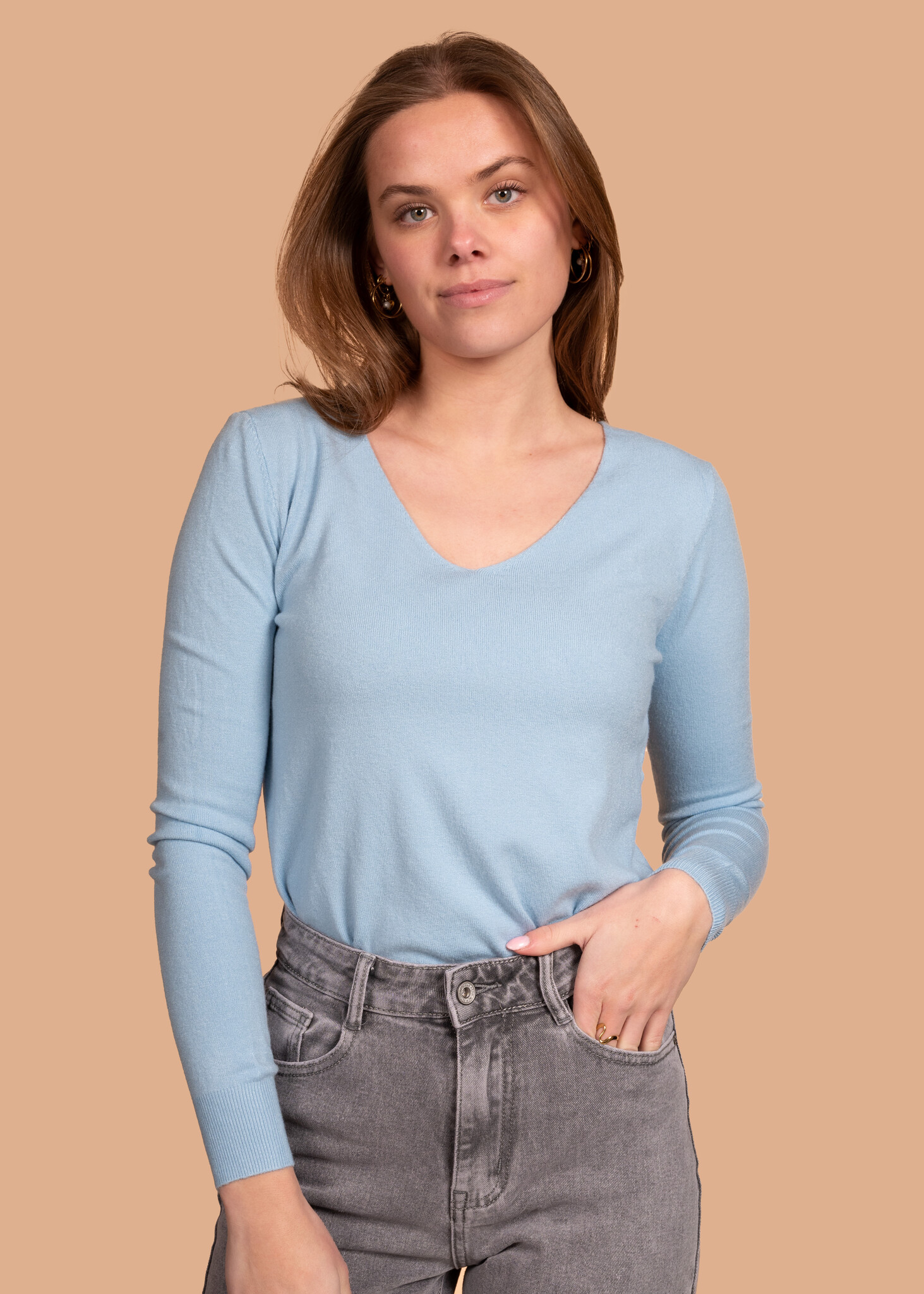 Deze basic top met v-hals in het blauw is een echte must-have! De top is gemaakt van een zachte en comfortabele stof en is perfect voor zowel een casual als een meer geklede look. Combineer met je favoriete jeans of draag onder een blazer voor een sophist