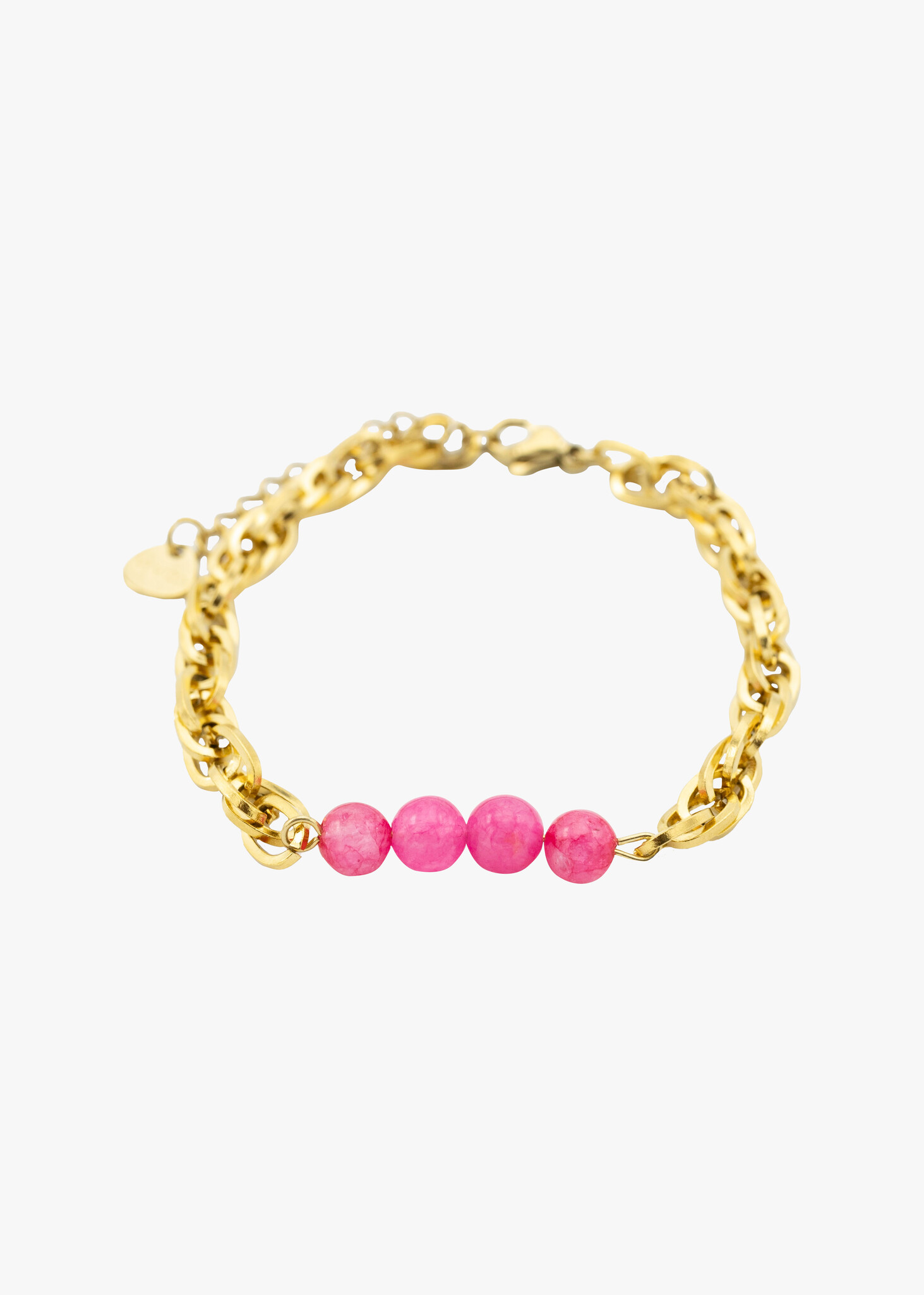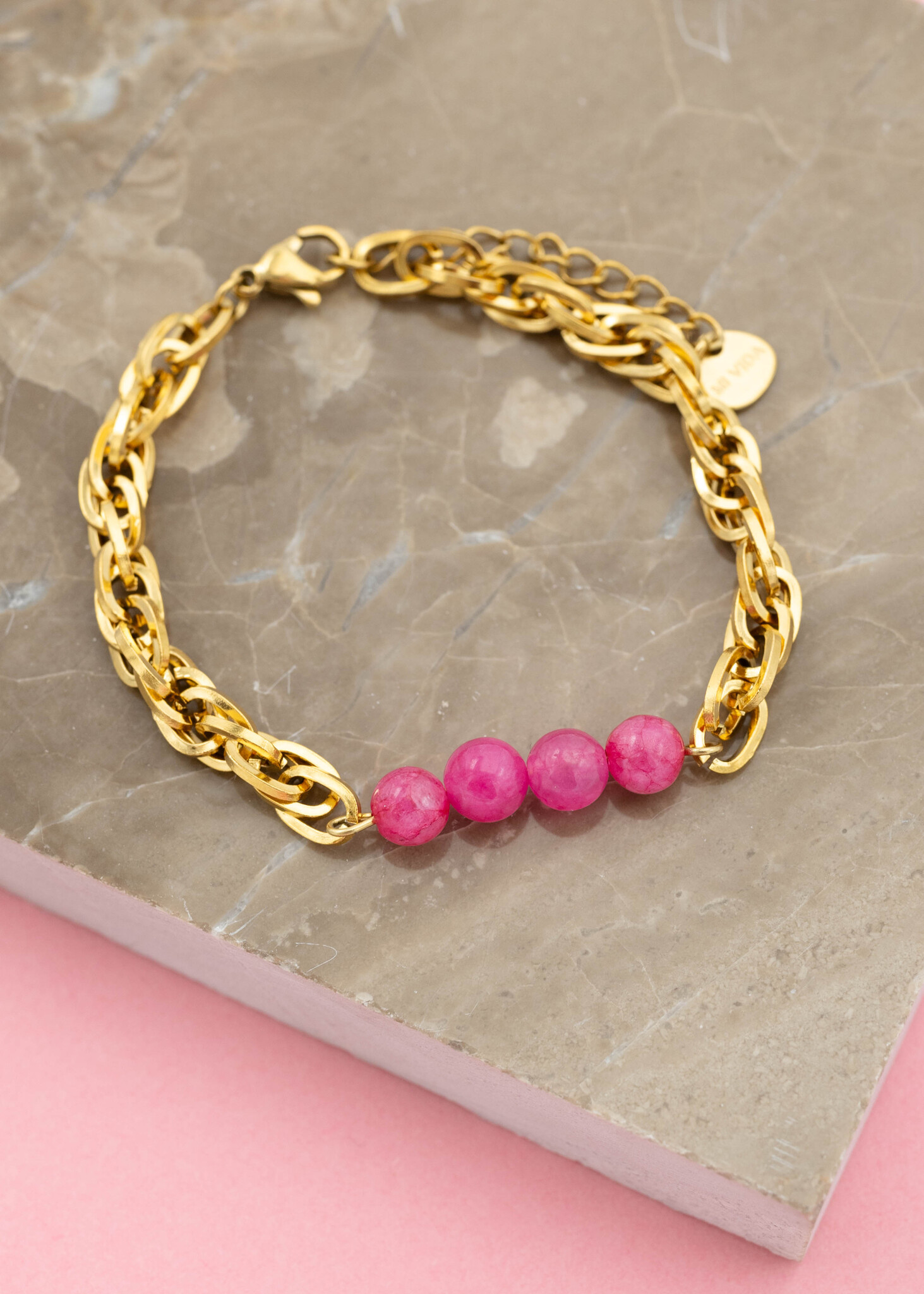 Deze prachtige schakelarmband met roze kralen is een echte eyecatcher! De combinatie van de gouden schakels en de vrolijke roze kralen geven de armband een unieke en trendy look.
