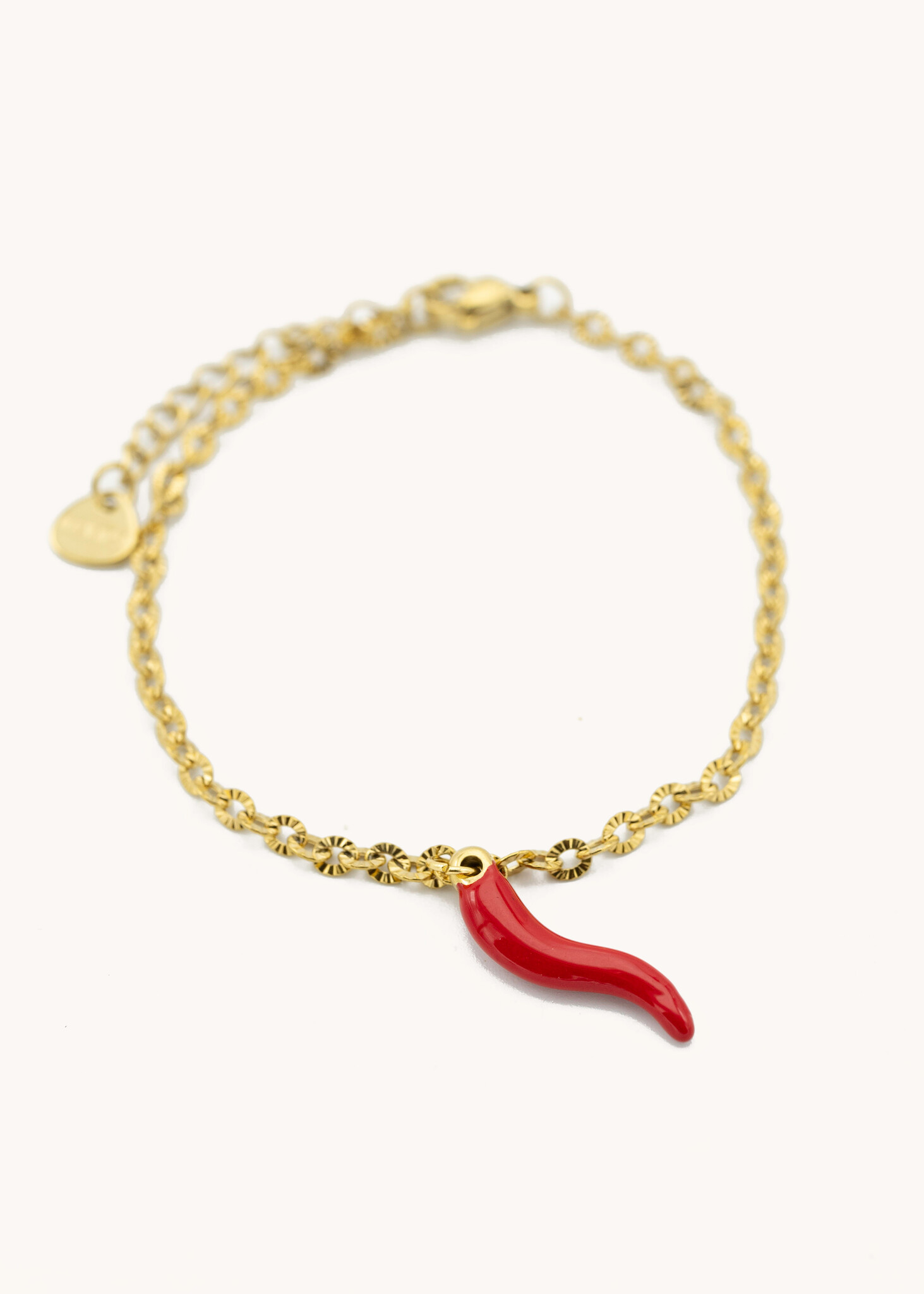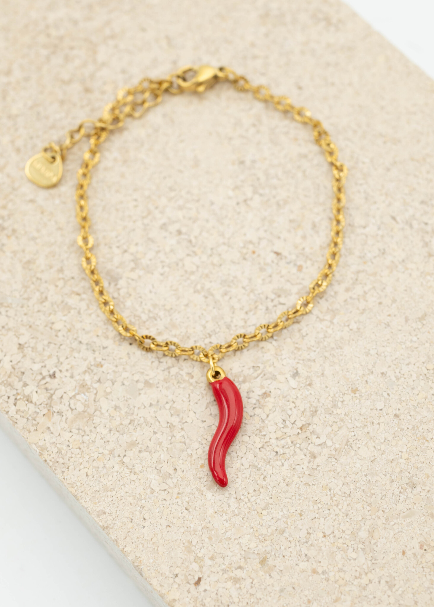 Spice up your life (en je sieradencollectie!) met deze superleuke bedelarmband! De gouden armband is versierd met een schattig bedeltje in de vorm van een rode peper. Hoe cool is dat?!