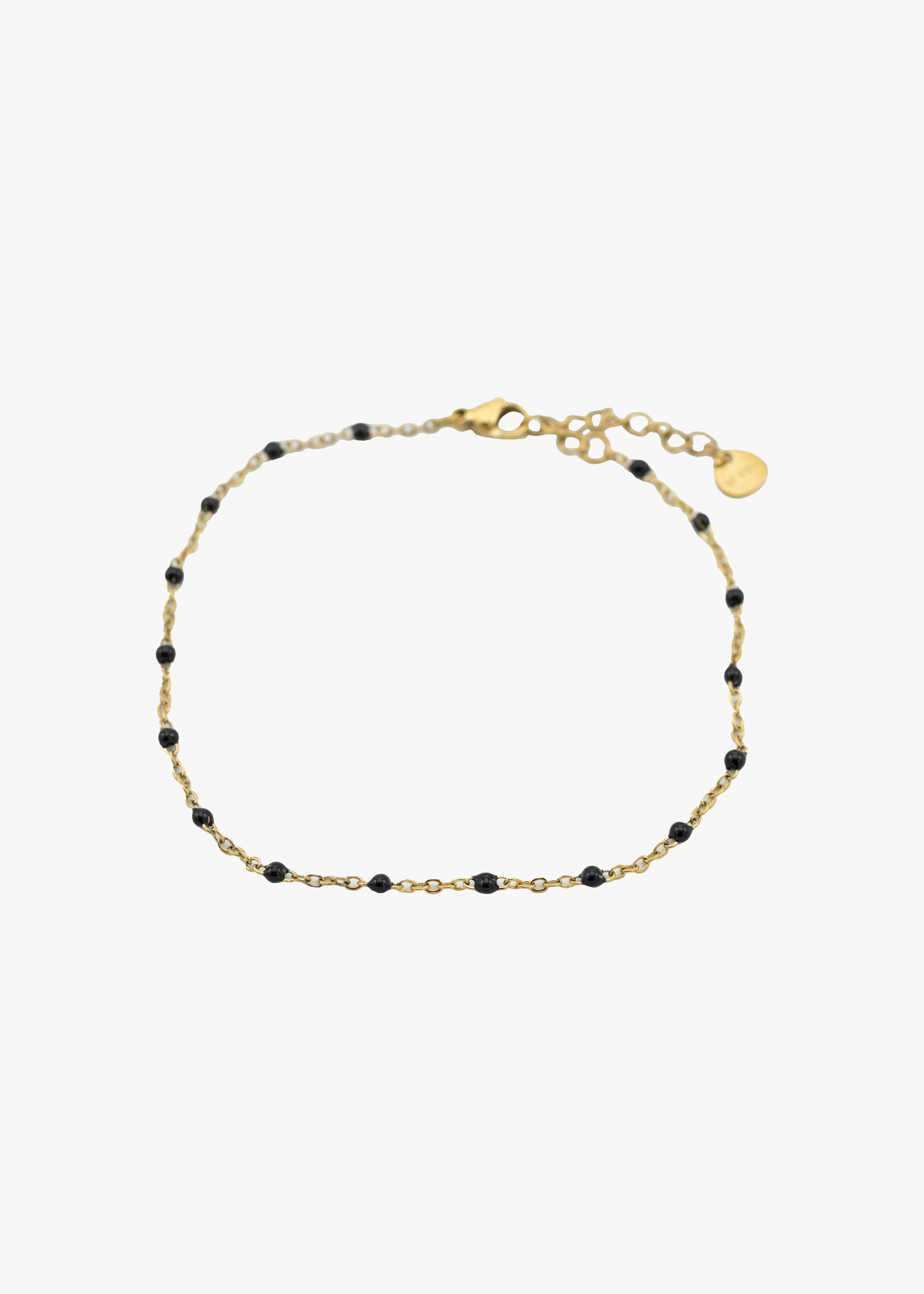 De combinatie van de goudkleurige ketting en de subtiele zwarte bedeltjes geeft deze enkelband een elegante en toch speelse uitstraling. Draag hem naar het strand, tijdens een avondje uit of gewoon als stijlvolle touch bij je dagelijkse outfit.