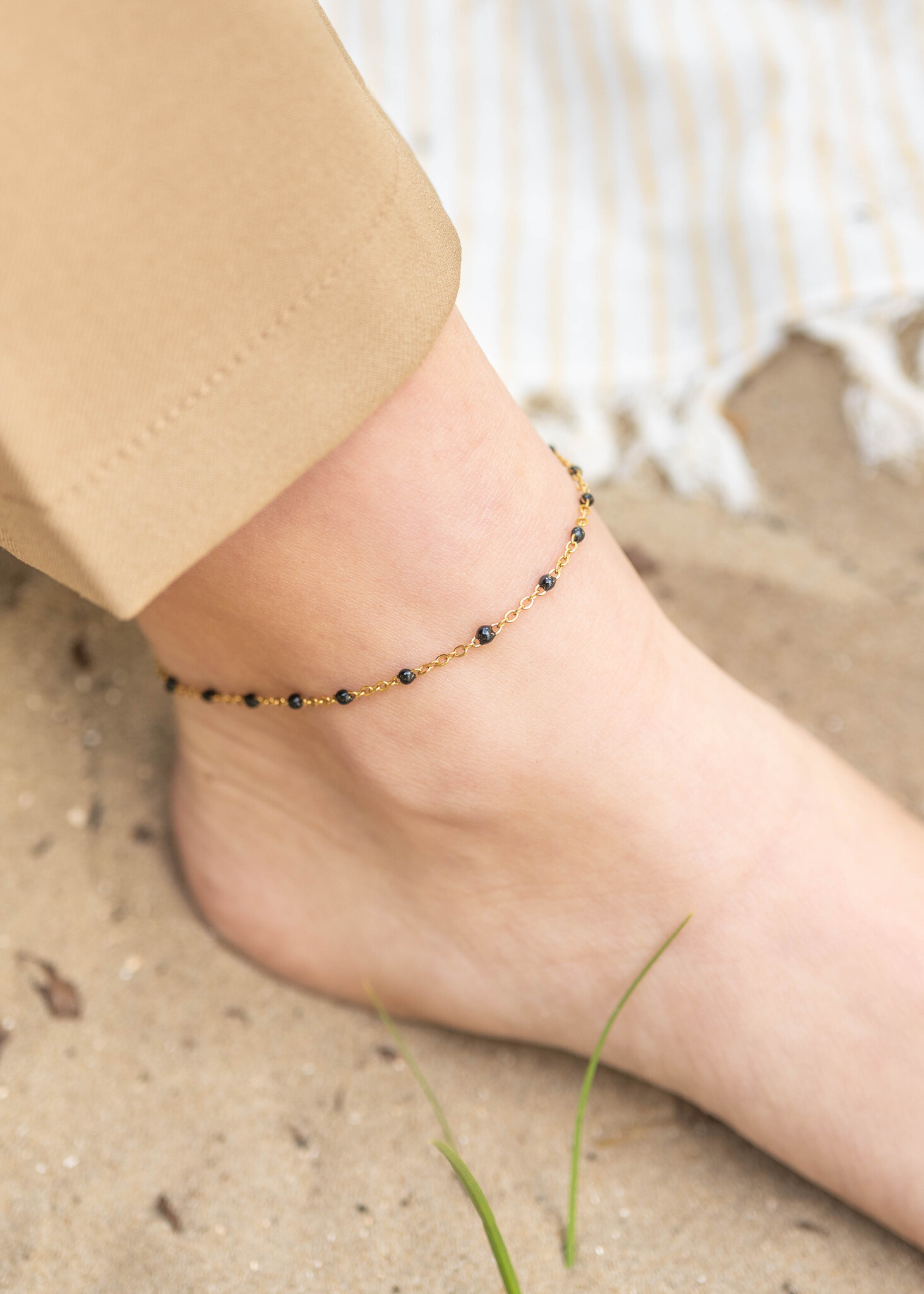 Deze delicate enkelband met zwarte kralen is de perfecte manier om je zomerse look af te maken!
