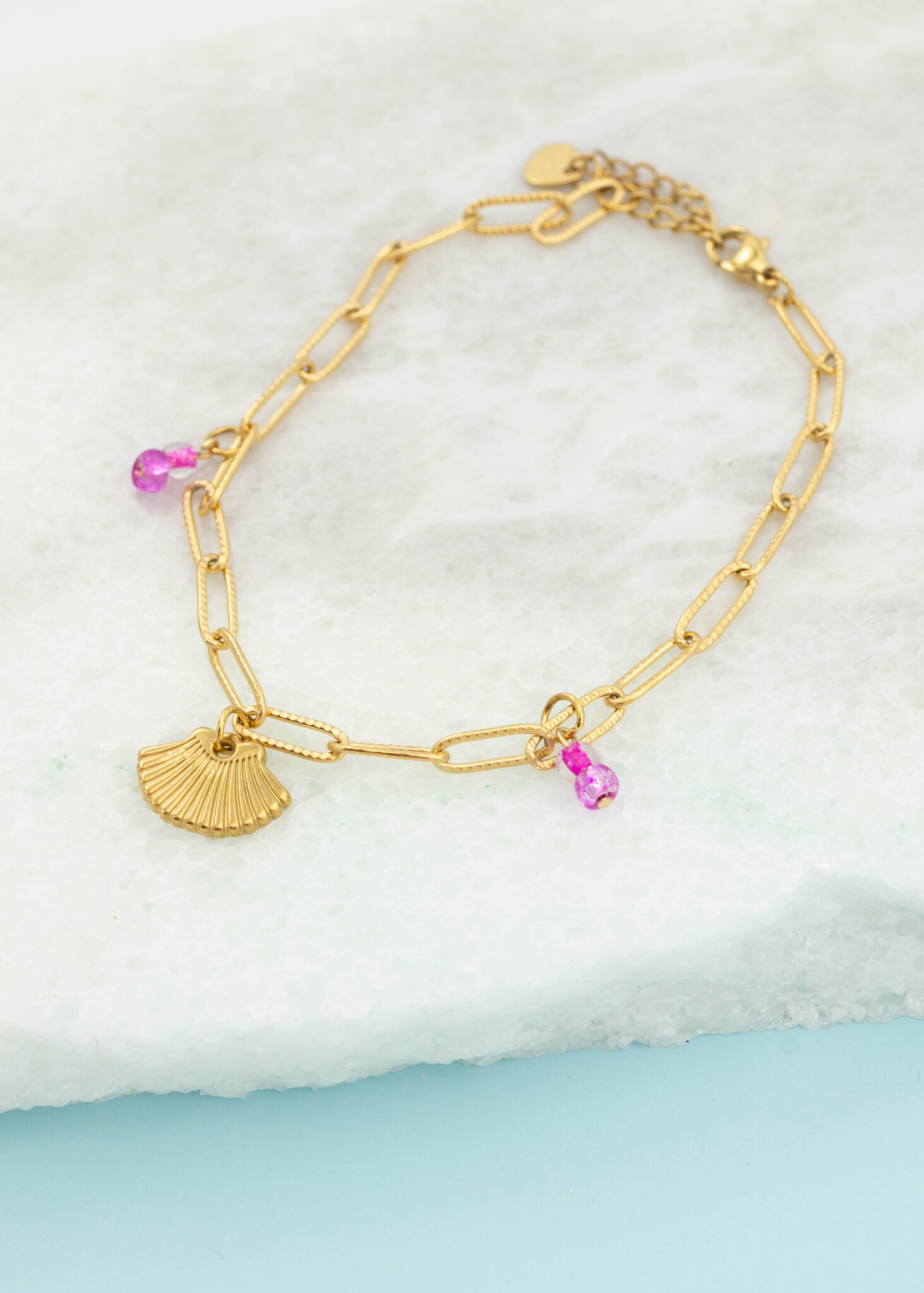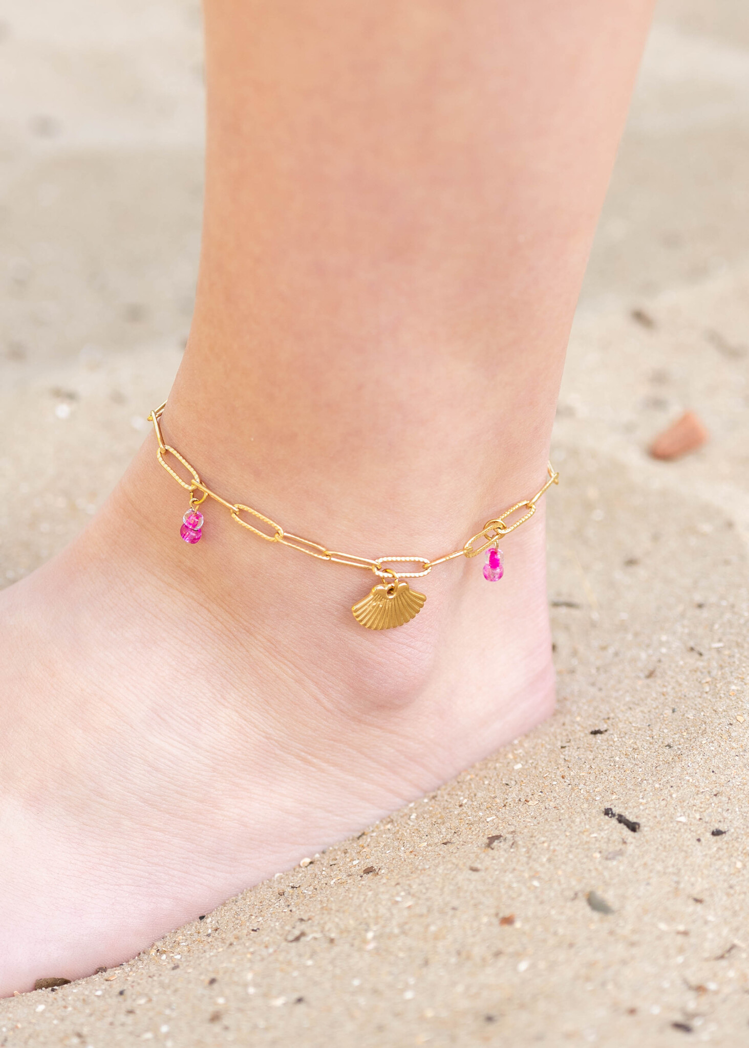 Deze bedel enkelband is de perfecte accessoire voor zomerse dagen. Draag hem naar het strand, tijdens een festival of gewoon lekker casual in je vrije tijd. De roze kralen geven je outfit een vrolijke touch en de schelp bedel zorgt voor een subtiele bohemian vibe.