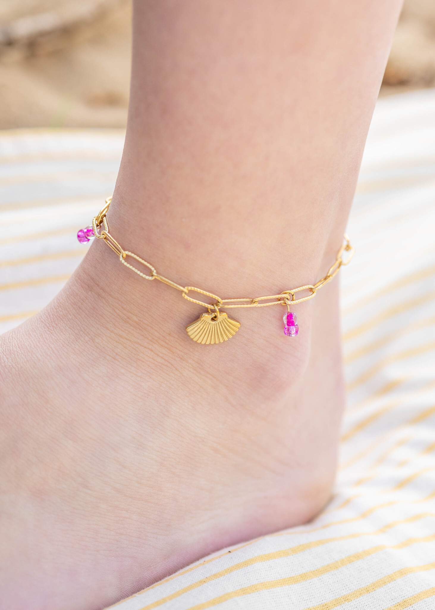 Deze gouden enkelband met roze kralen en schelp bedel is een echte eyecatcher! De combinatie van de elegante gouden kleur met de speelse roze kralen geeft deze enkelband een unieke en trendy uitstraling.