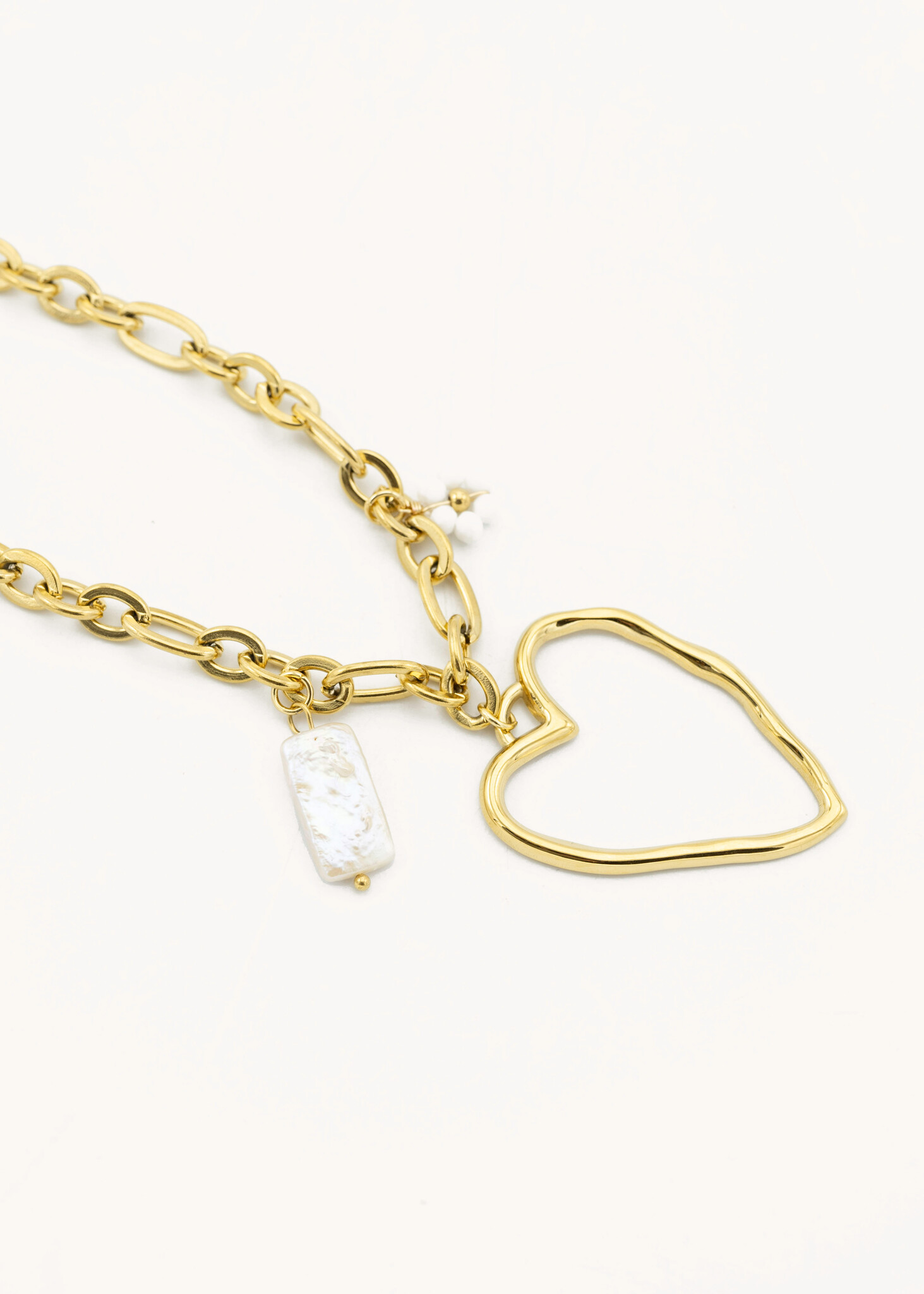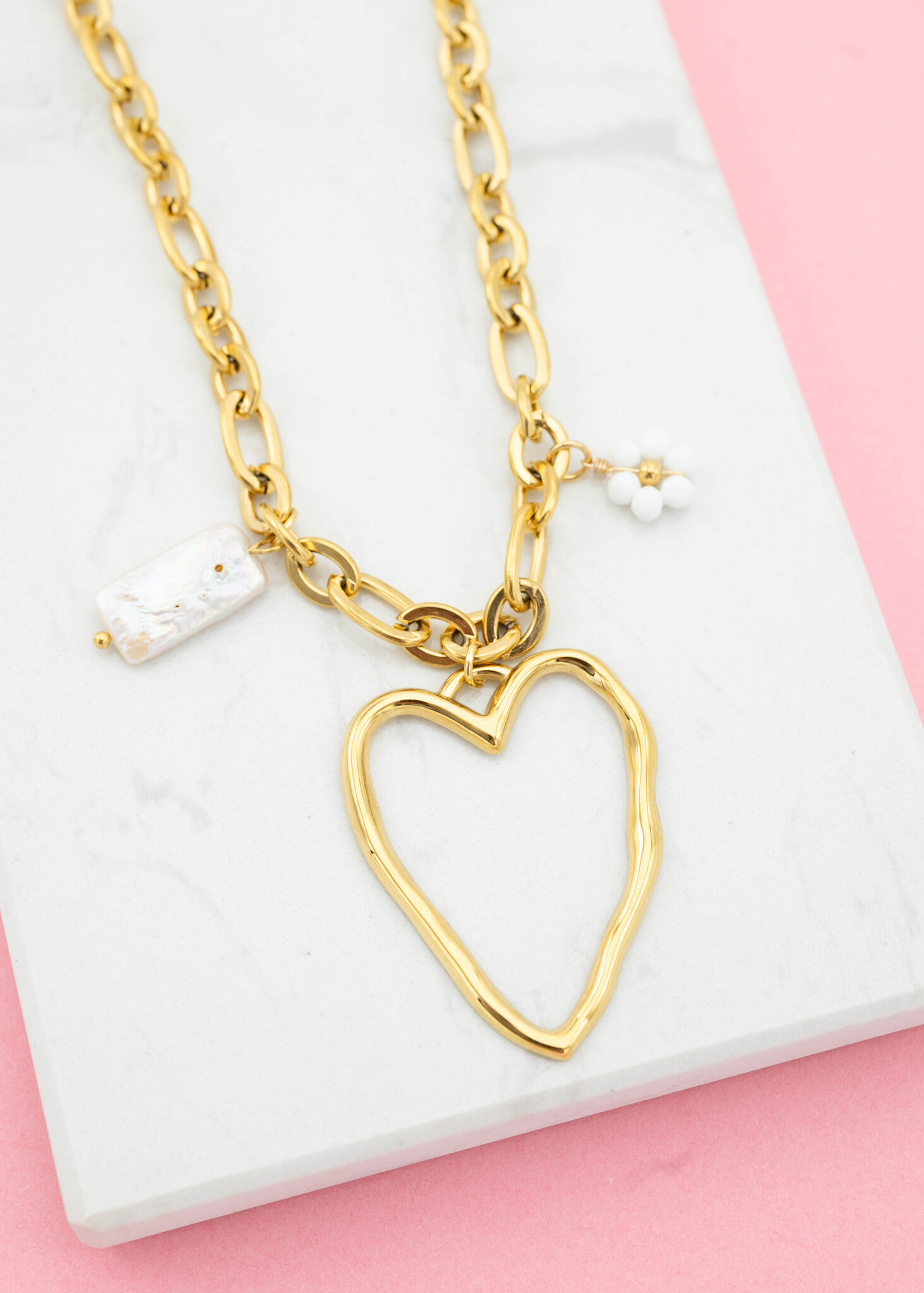 Deze bedel ketting is een echte eyecatcher! De schakelketting met groot open hart geeft je outfit meteen een trendy touch.