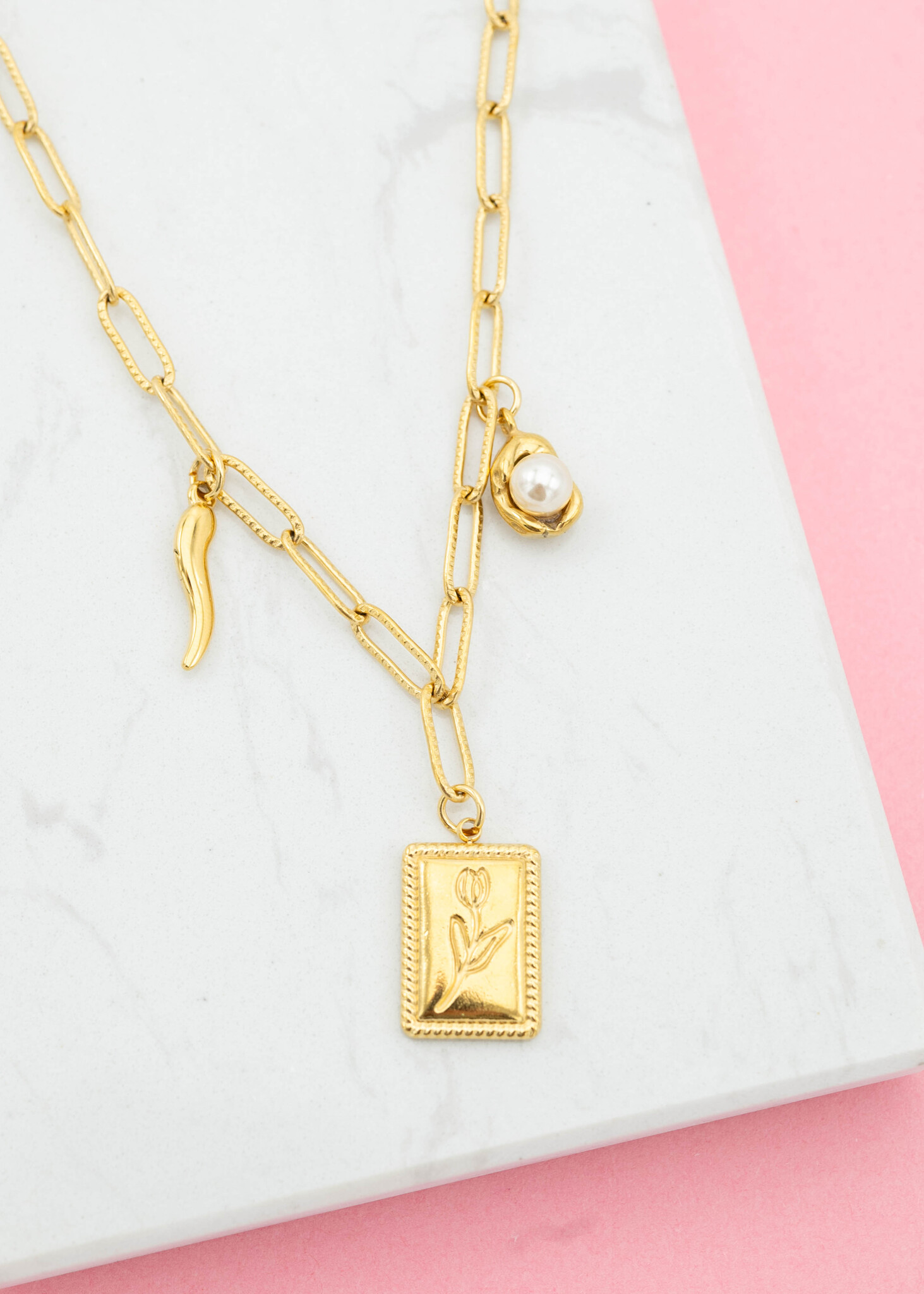 Deze gouden bedel ketting is een echte eyecatcher! De schakelketting is versierd met een prachtige bloem bedel en andere speelse details, wat zorgt voor een unieke en trendy look.