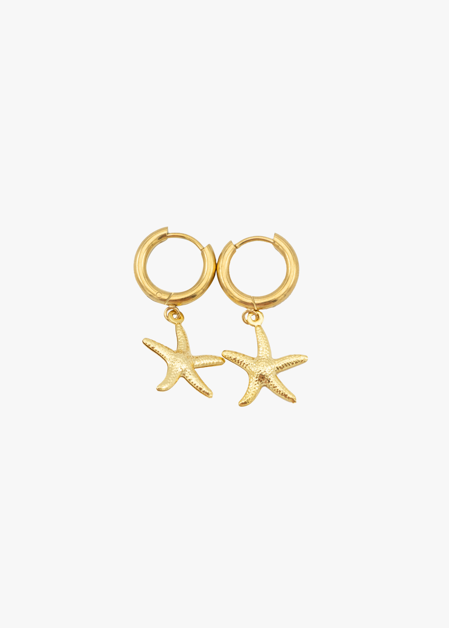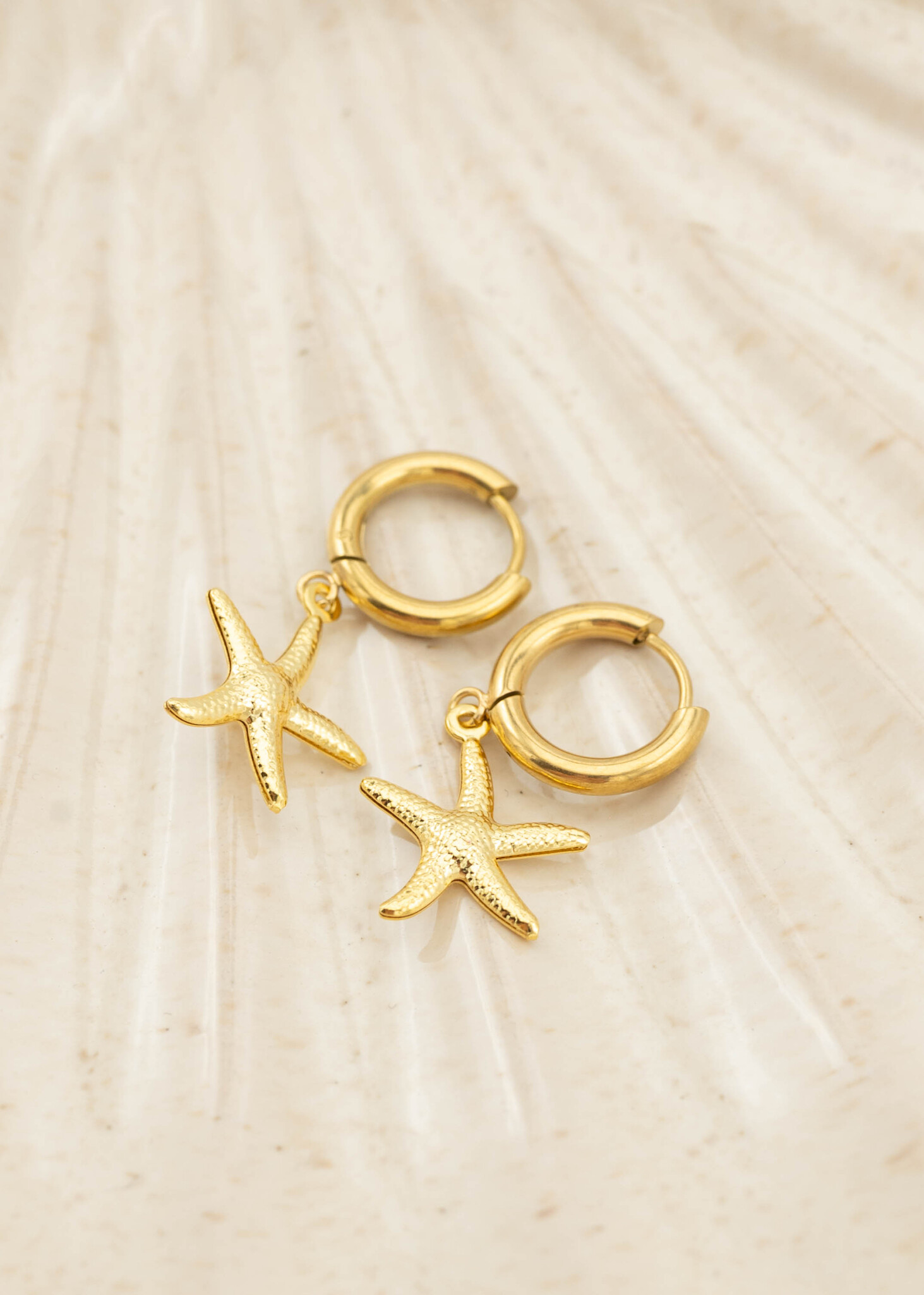 Deze gouden oorbellen zijn een echte eyecatcher! Met hun subtiele bedel in de vorm van een zeester geven ze je look direct een zomerse touch.