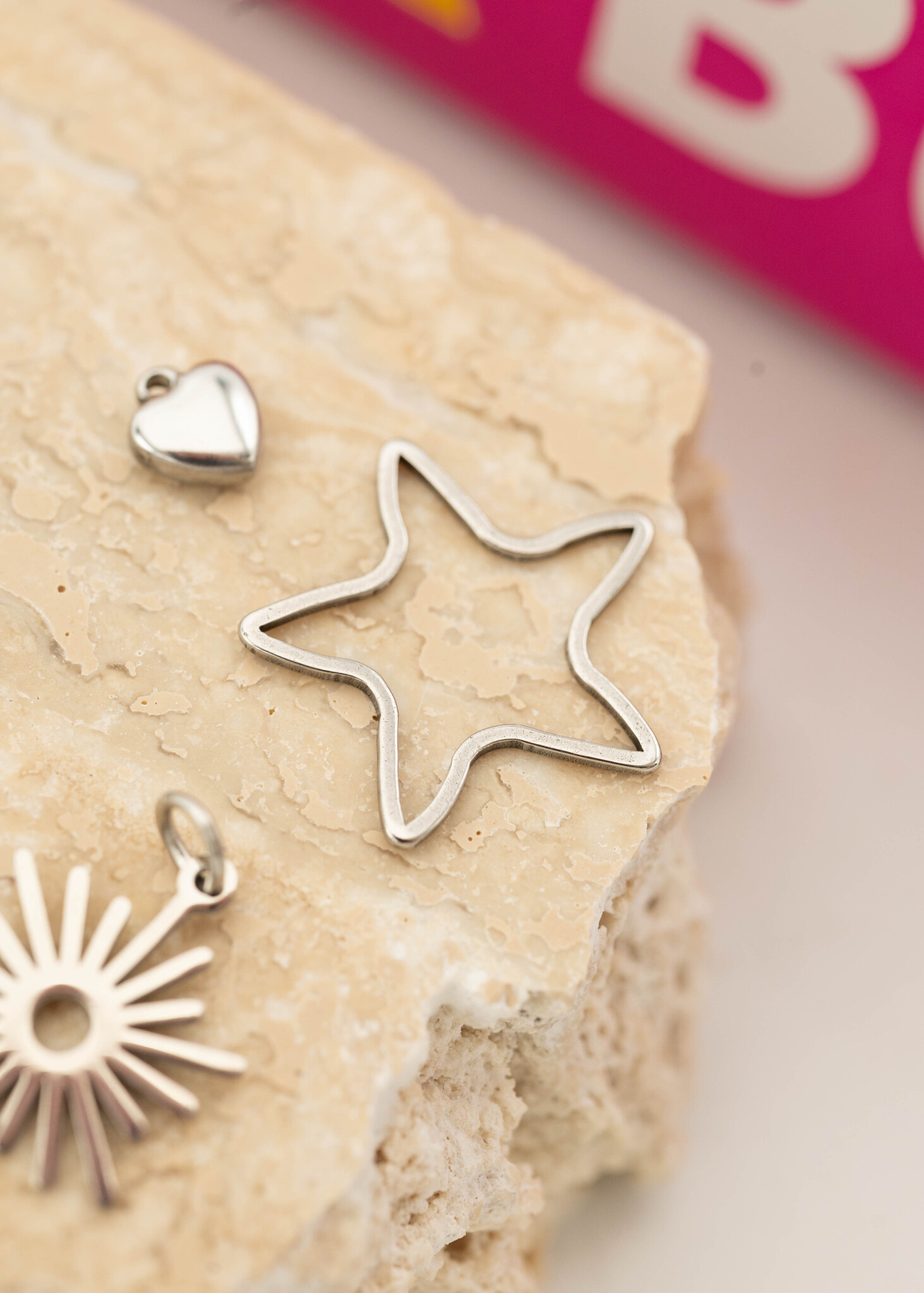 Deze bedel is een echte eyecatcher! Met zijn minimalistische design en elegante uitstraling is hij perfect om je favoriete ketting een persoonlijke touch te geven. De grote open ster voegt een vleugje speelsheid toe, zonder te overheersen.