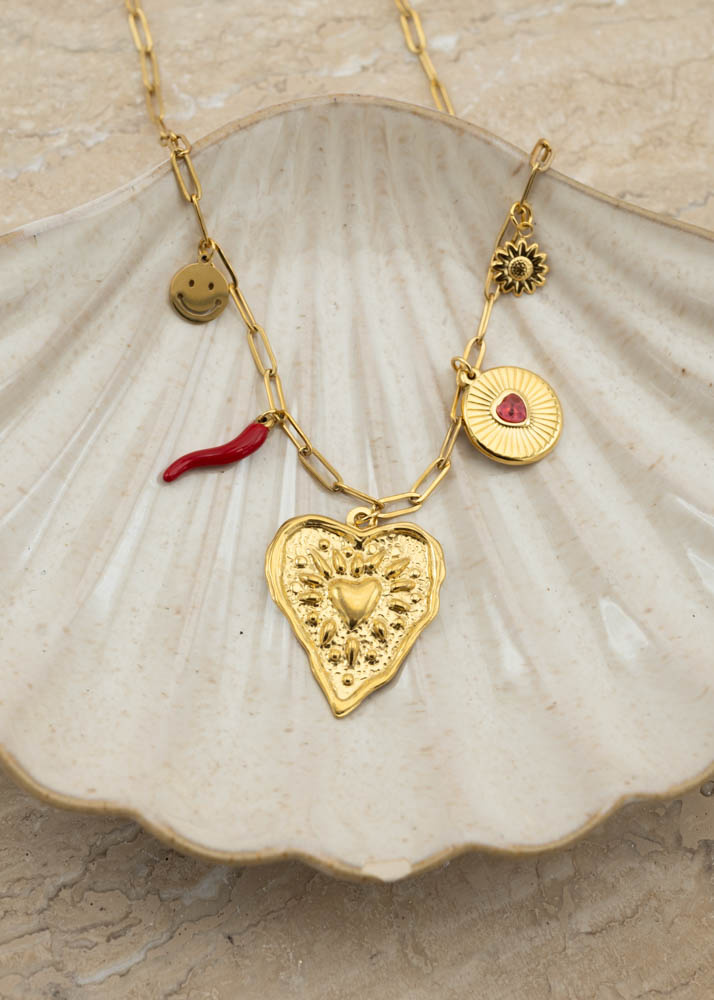Deze prachtige gouden bedel is een echte eyecatcher! De ronde vorm en het stralende goud geven hem een elegante uitstraling, terwijl het rode hartje in het midden voor een speelse touch zorgt.