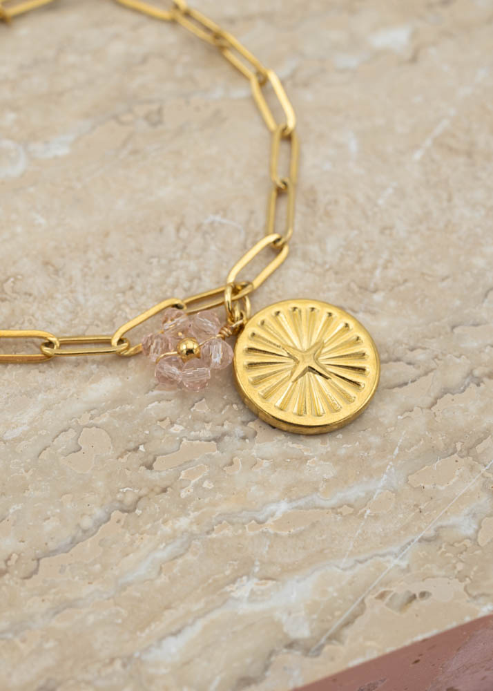 Deze gouden armband is een echte eyecatcher! Met zijn subtiele schakeltjes en bedeltje in de vorm van een bloem, geeft hij jouw look net dat beetje extra.
