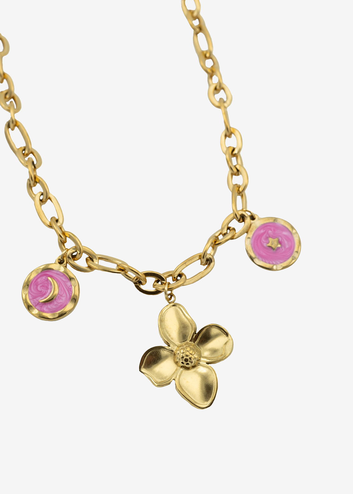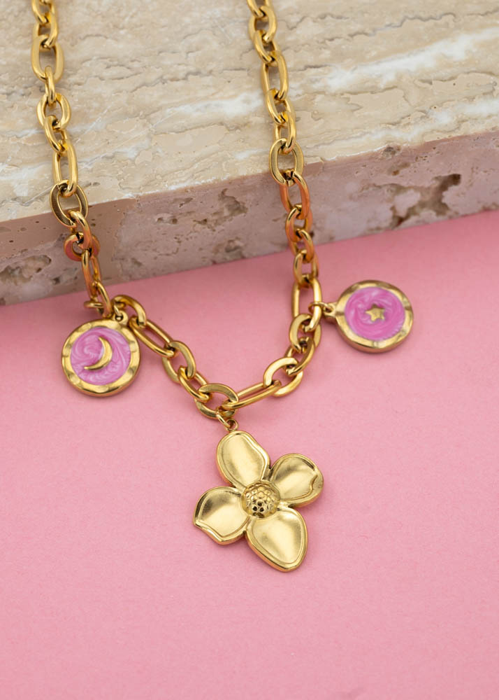 Deze gouden ketting is een echte eyecatcher! Met de speelse bedels, waaronder een grote bloem en roze details, voeg je direct een vleugje kleur en vrolijkheid toe aan je look.