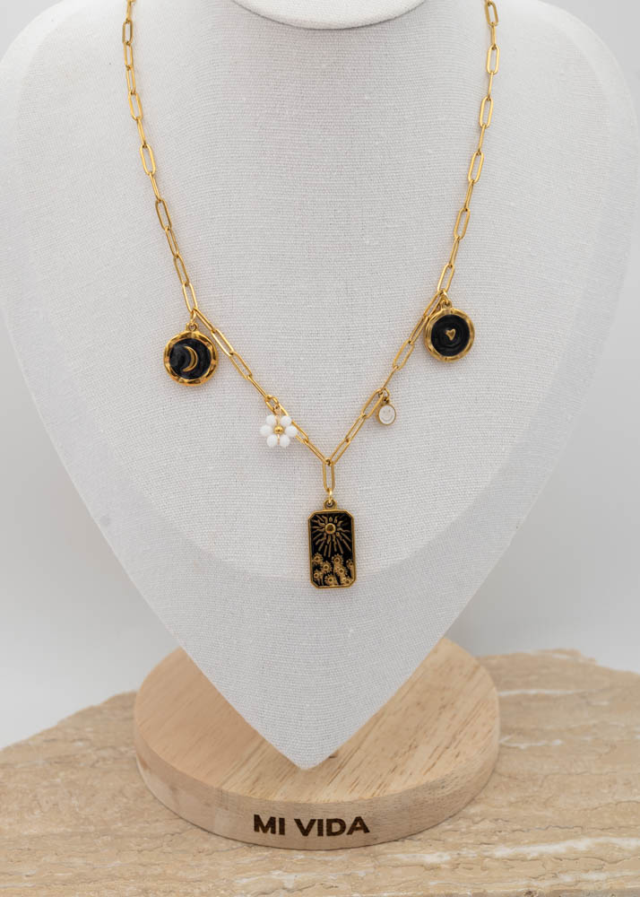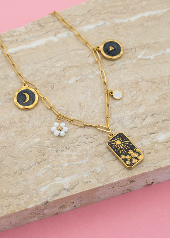 Deze trendy bedelketting met zwarte bedels is een echte eyecatcher! De gouden ketting is gemaakt van stainless steel en heeft een speelse mix van bedels in zwart-wit tinten. Perfect voor een casual look of om je outfit net dat beetje extra te geven.