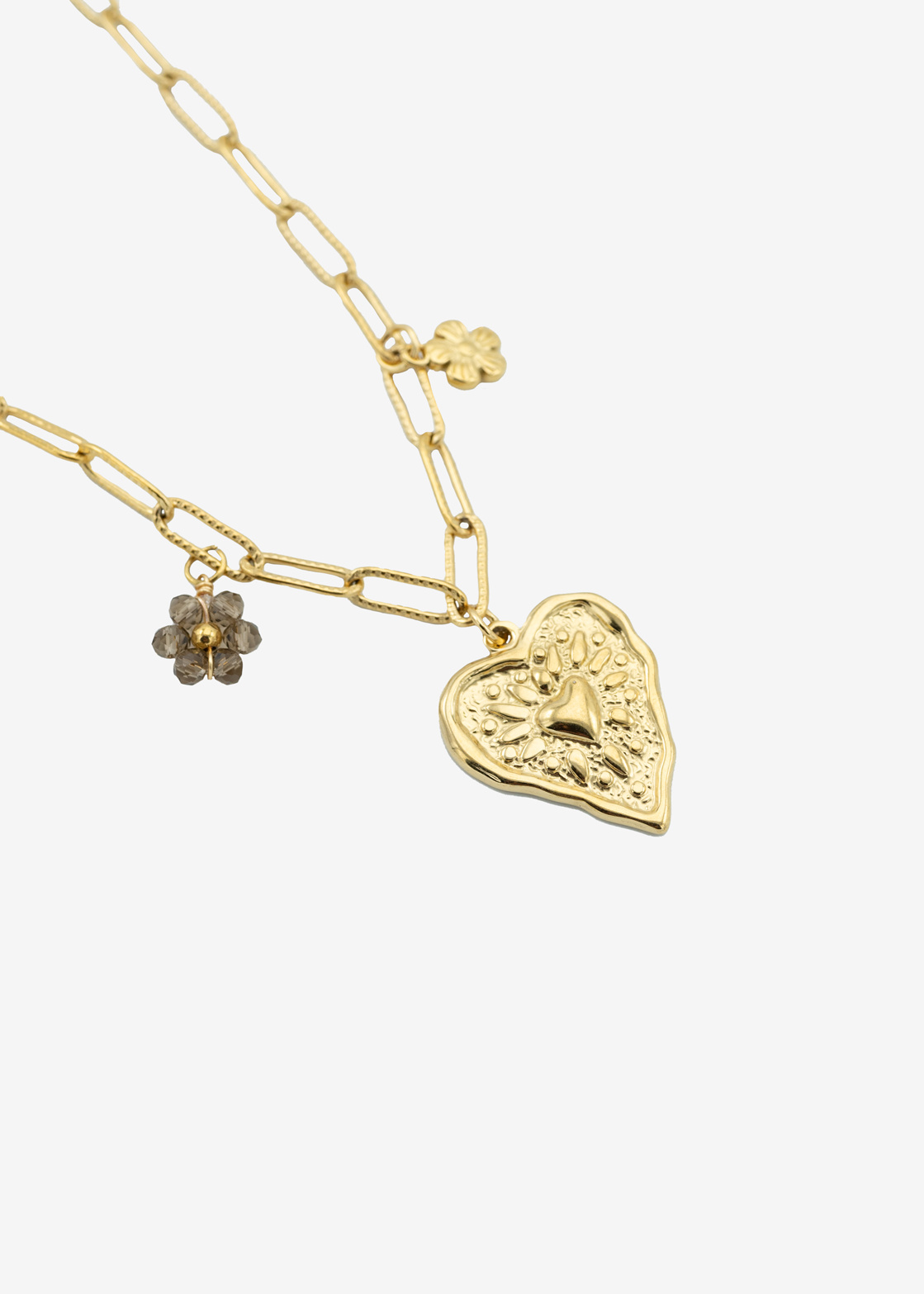 Klaar om je look een romantische touch te geven? Deze prachtige gouden schakelketting is perfect voor meiden die houden van een beetje bling! Met de schattige bloemetjes en het grote hart als bedels steel je gegarandeerd de show.
