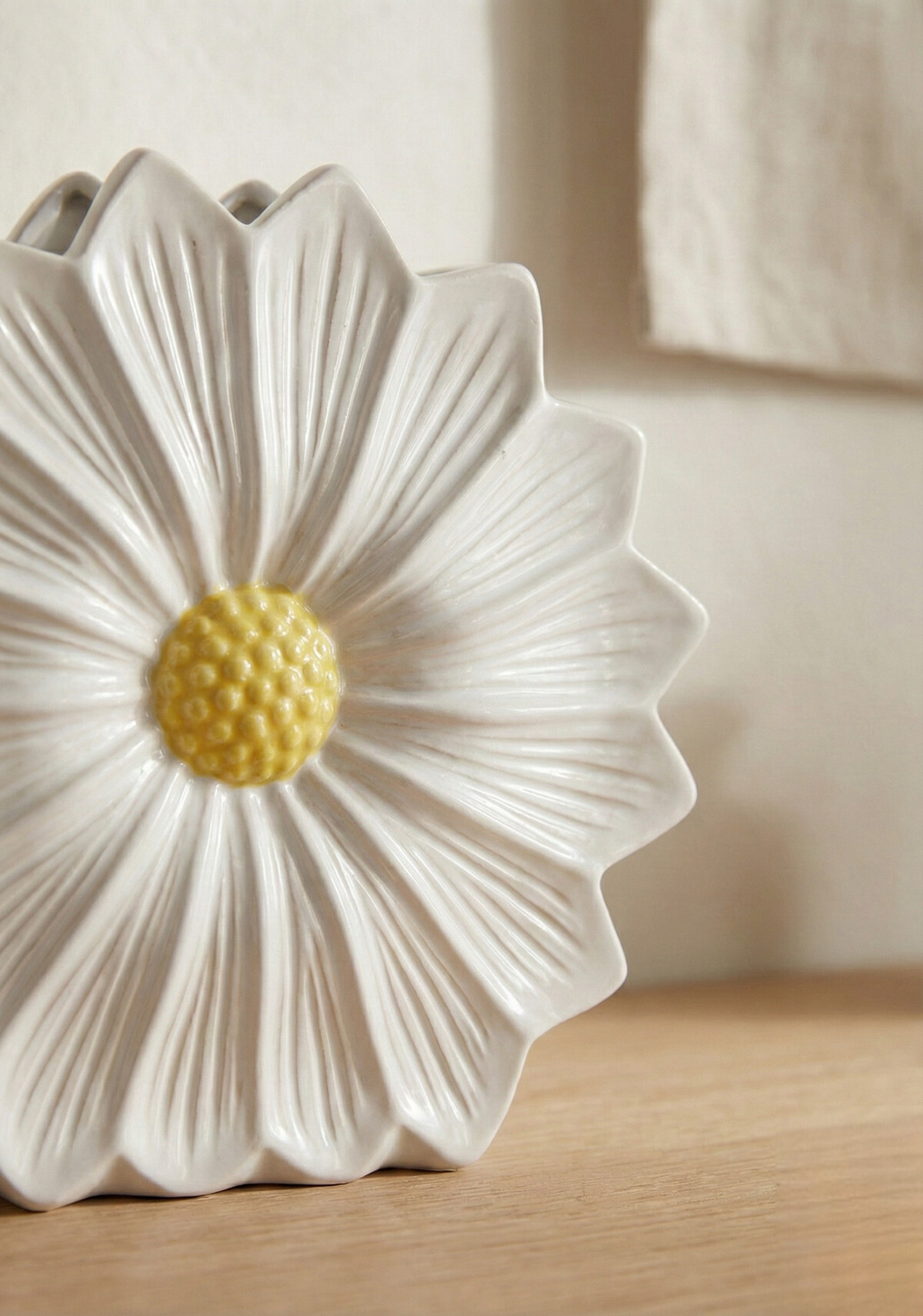 ProductomschrijvingDe speelse bloemvorm, de frisse witte kleur en het vrolijke gele hart maken dit vaasje tot een echte eyecatcher.