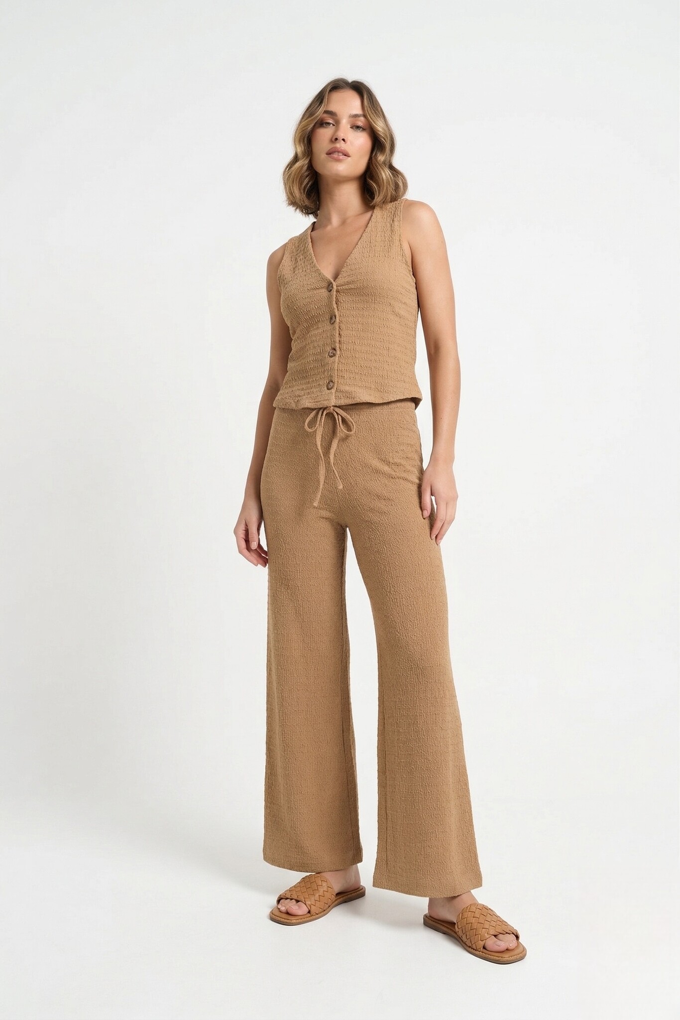 Chill vibes only! Deze jogger broek is de perfecte mix van comfort en stijl. De wafelstructuur geeft 'm een unieke look, waardoor je er altijd fashionable uitziet, of je nou op de bank hangt of de stad in gaat. En die bruine kleur? Helemaal on-trend deze zomer!