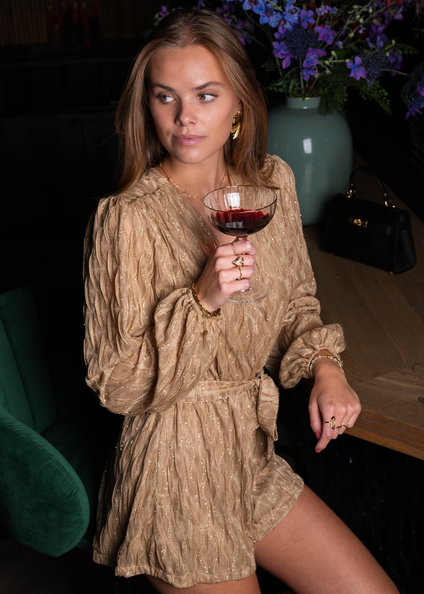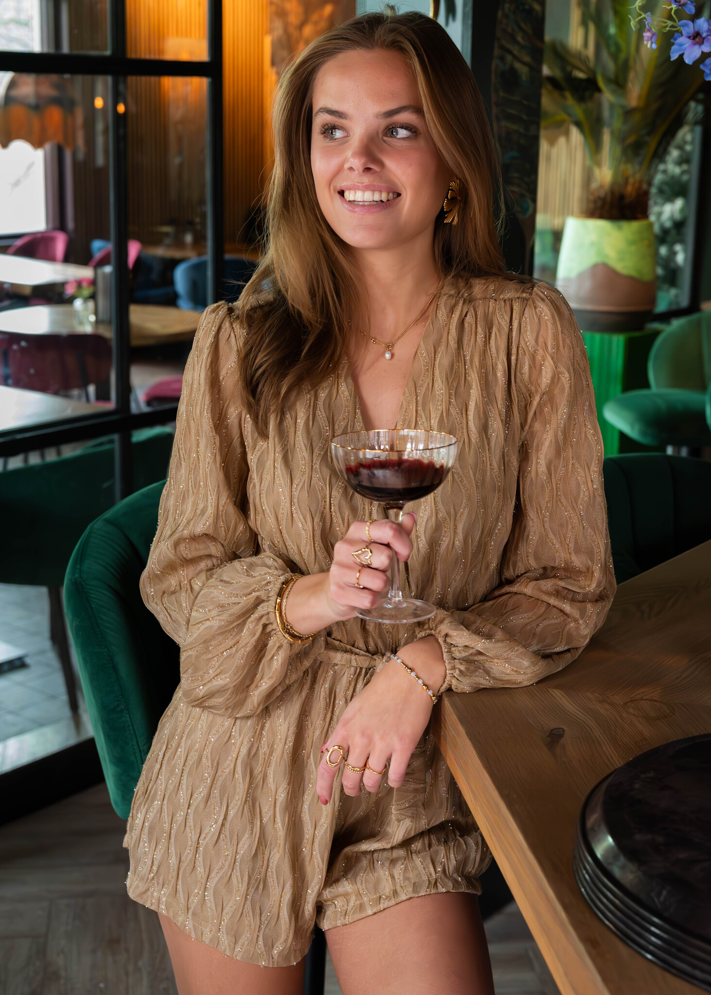 Deze subtiele camel jumpsuit met glitter is een echte eyecatcher! Het glinsterende patroon geeft je instant een feestelijke look, terwijl de camel kleur zorgt voor een warme en stijlvolle touch.