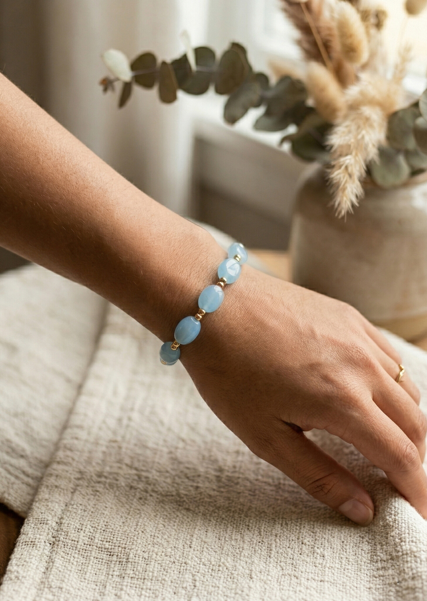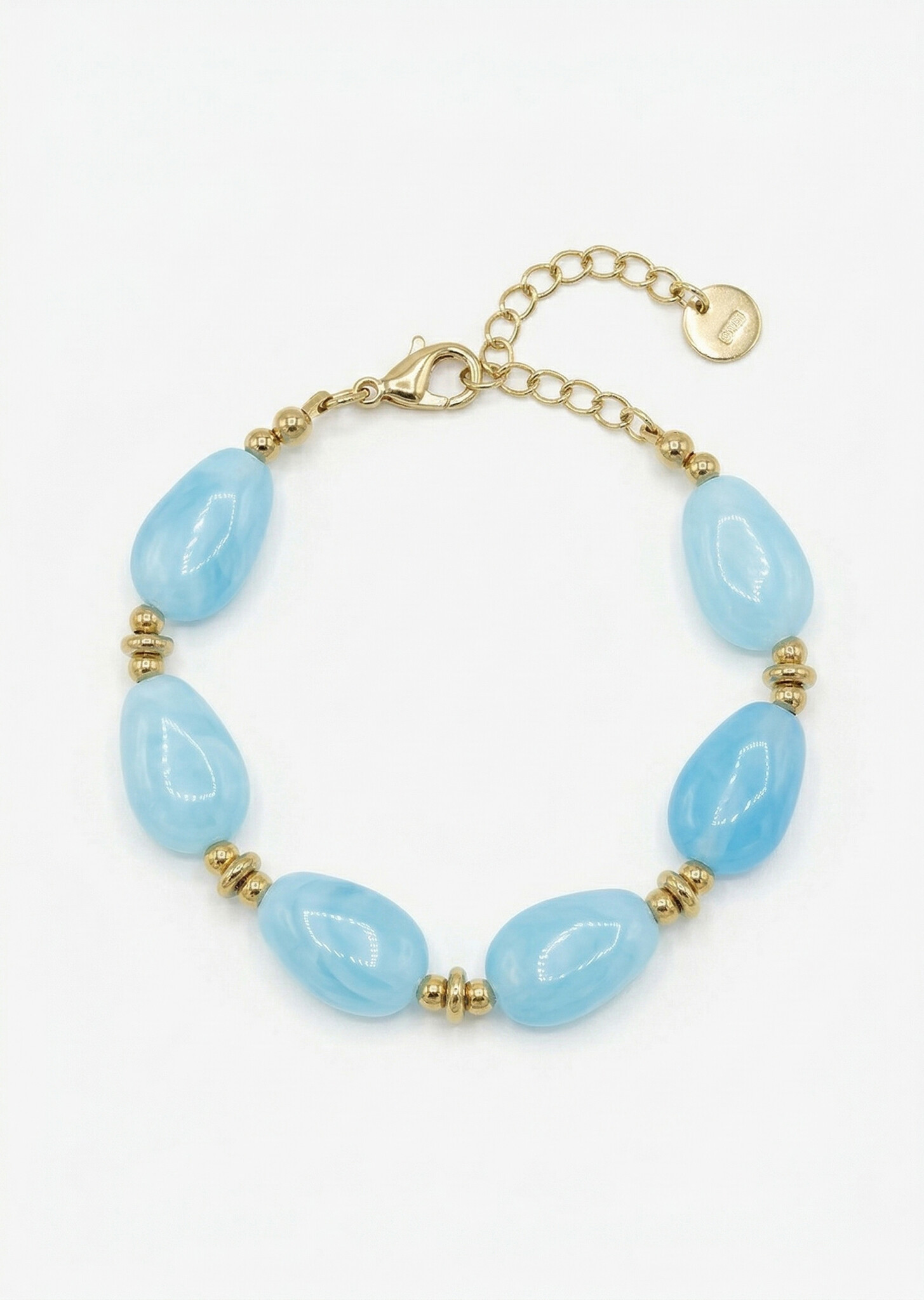 Deze armband met blauwe kralen is de perfecte finishing touch voor elke outfit. De zachte blauwe tint geeft een frisse en vrolijke vibe, waardoor je look helemaal compleet wordt. De gouden details tussen de kralen zorgen voor een subtiele sparkle. Een echte must-have voor jouw sieradencollectie!