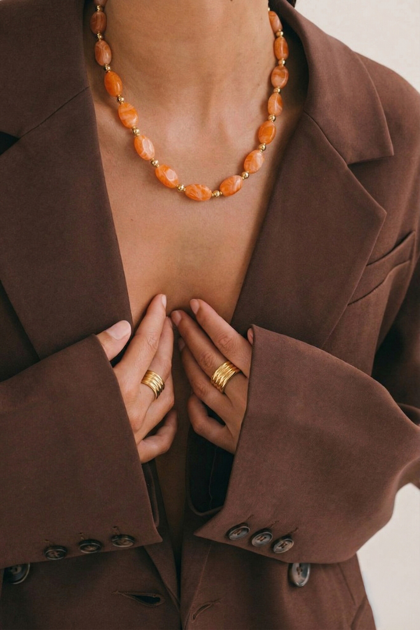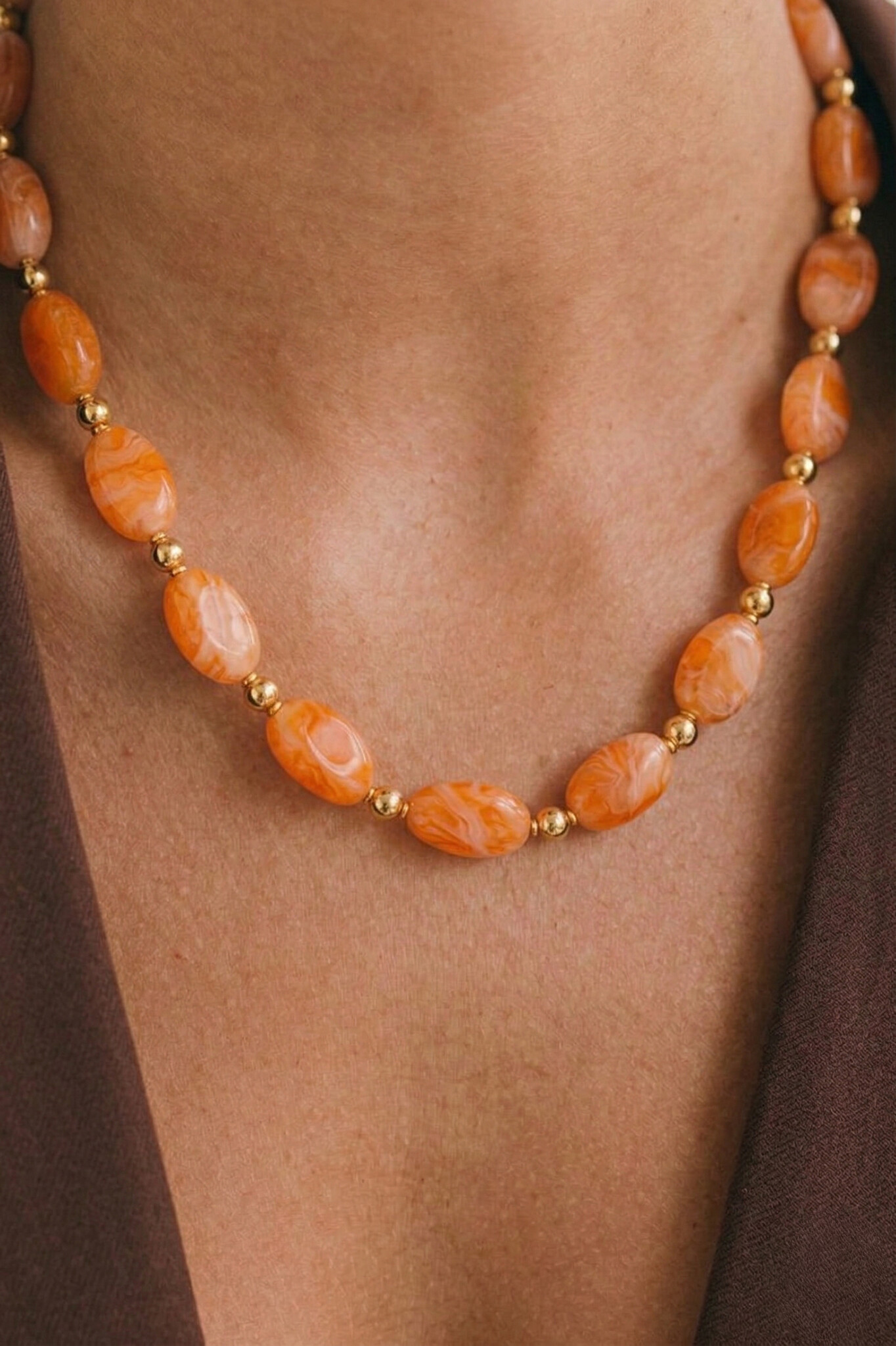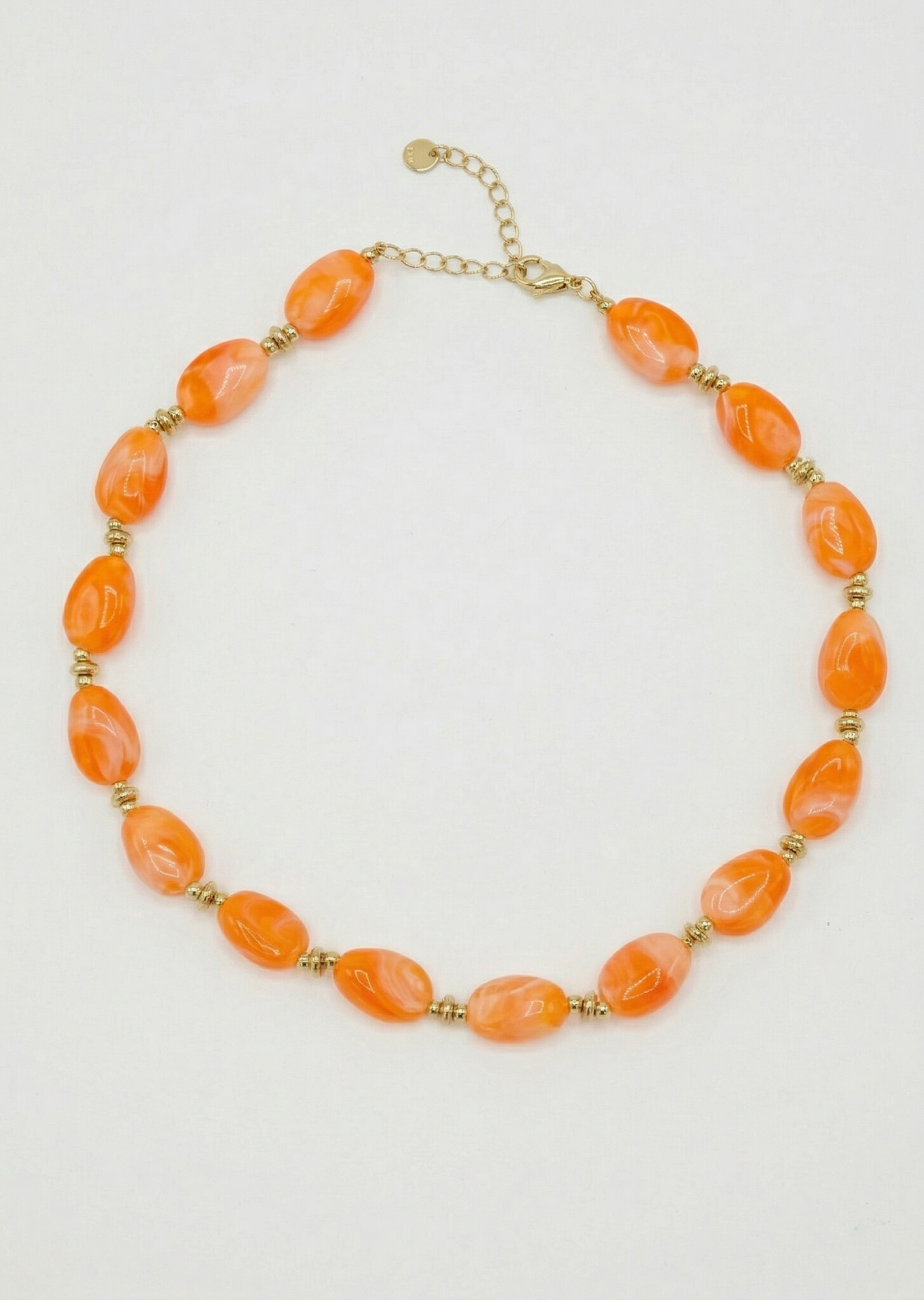 Deze prachtige oranje ketting is de perfecte finishing touch voor elke outfit. De warme, oranje tint van de kralen geeft je look een zonnige en energieke vibe. De gouden details geven de ketting een extra touch of glamour. Gemaakt van stainless steel, dus je kunt er lekker lang van genieten! Of je nu een casual outfit draagt of je chique wilt kleden, deze ketting maakt je look helemaal af.
