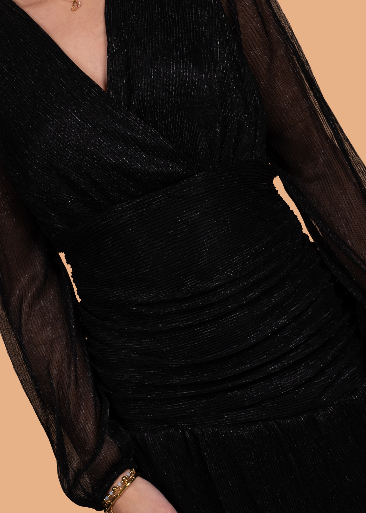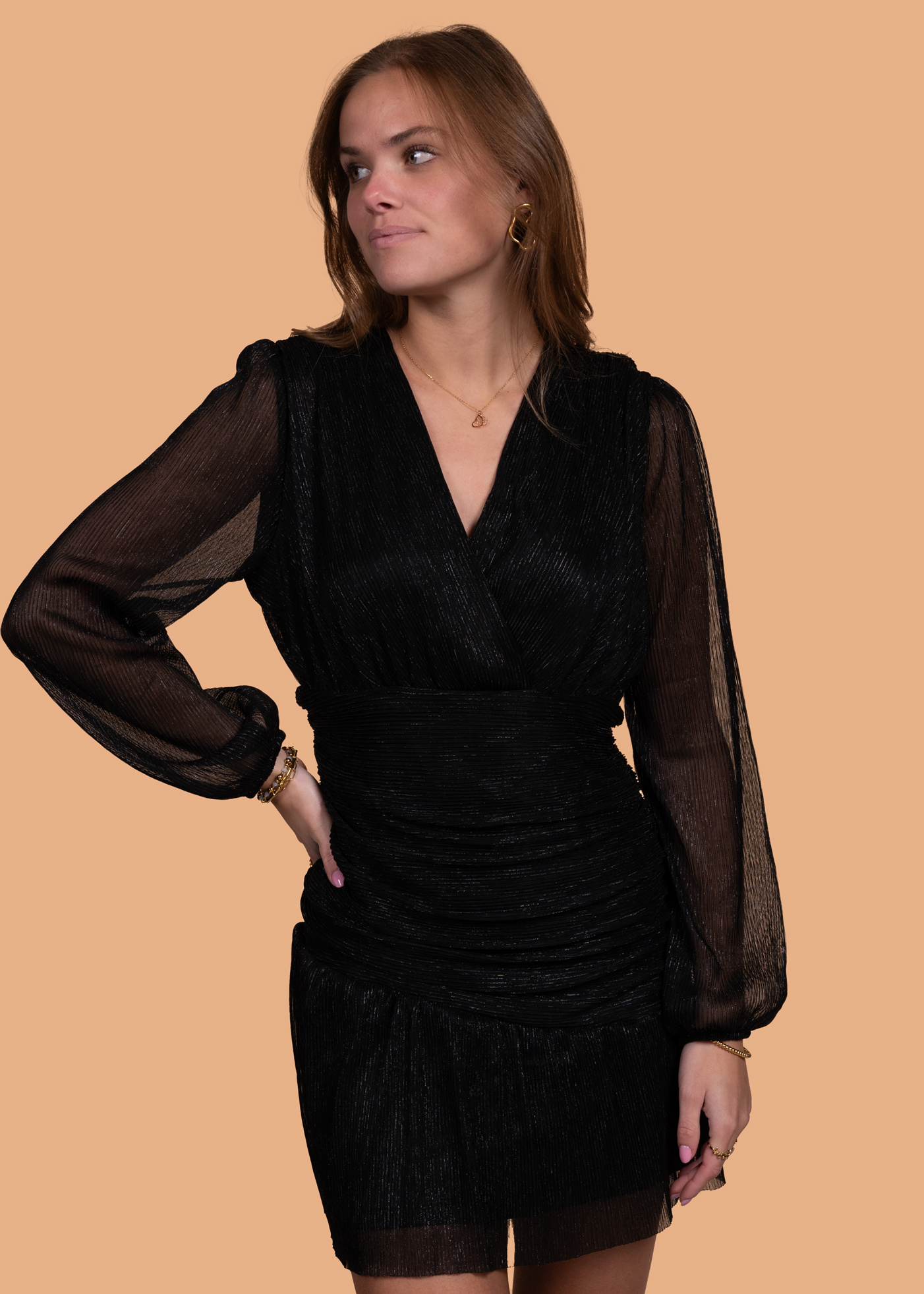 Klaar om te stralen op je volgende feestje? Deze zwarte feestjurk is een absolute musthave voor jouw garderobe! De subtiele glitter geeft je een elegante sparkle, perfect voor een avondje uit.