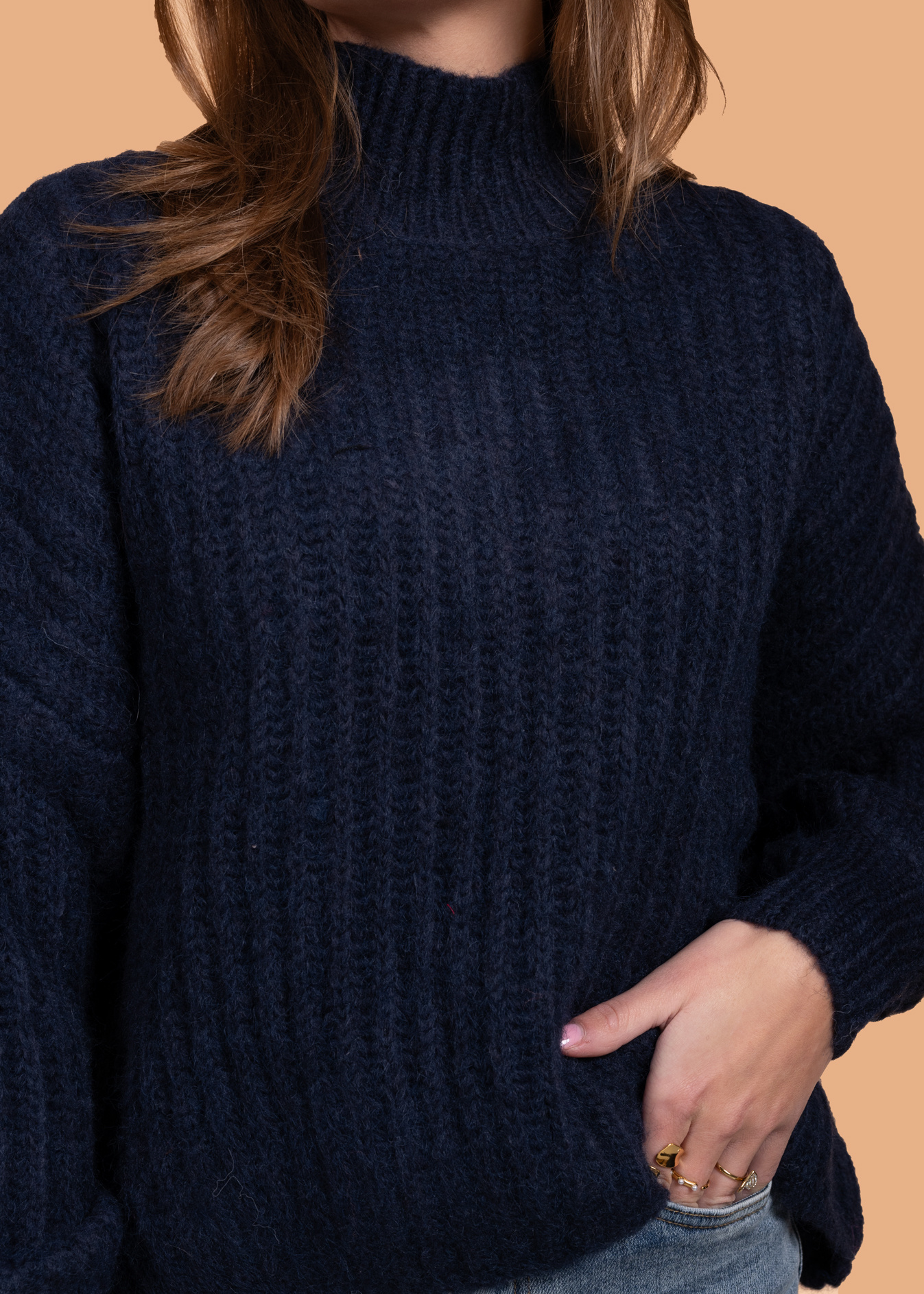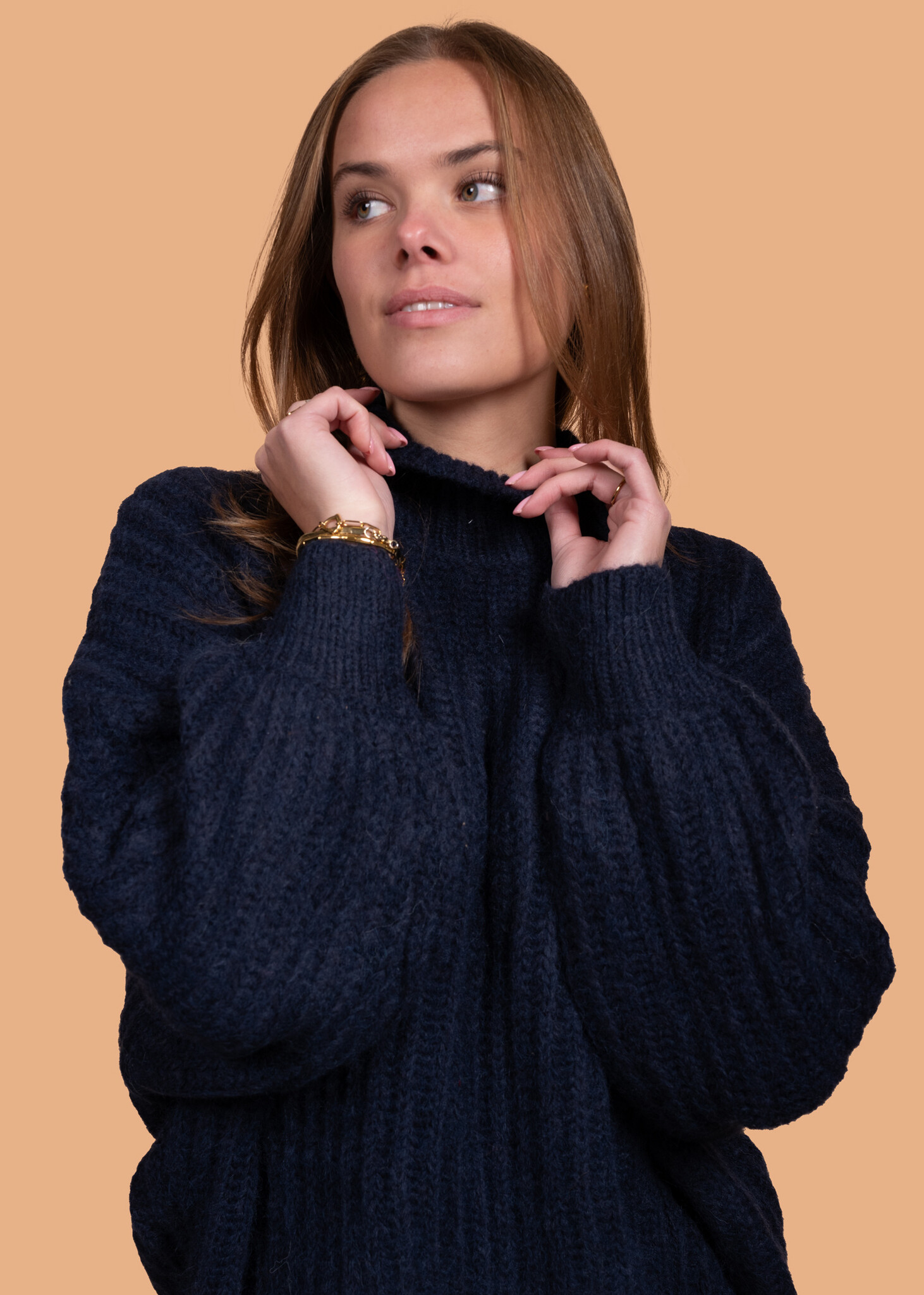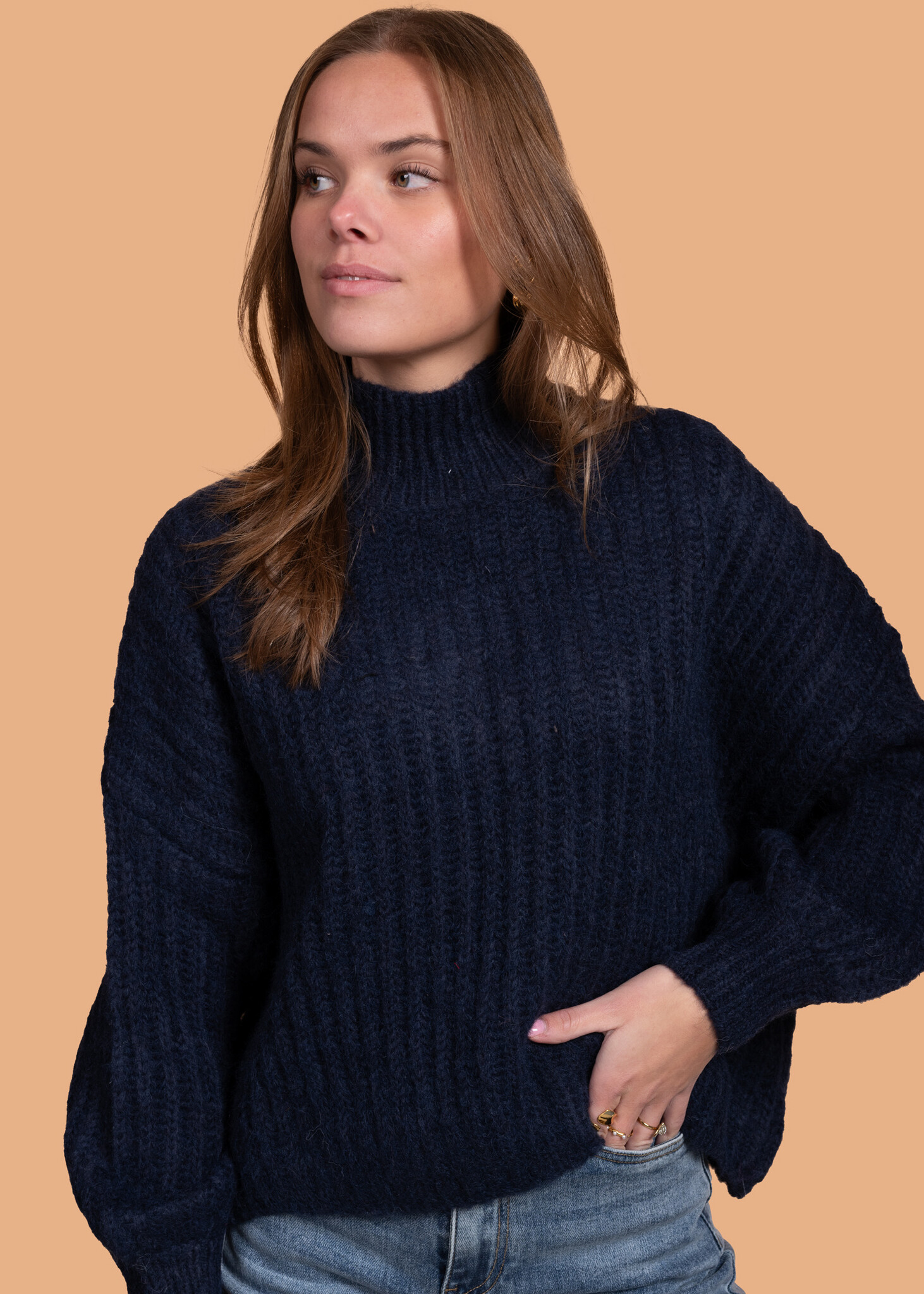 De blauwe coltrui is gebreid met een fijn patroon en heeft een relaxte pasvorm. Zo zit je er warmpjes bij zonder in te leveren op stijl. Ideaal voor een comfy herfstwandeling of een knusse winteravond op de bank.