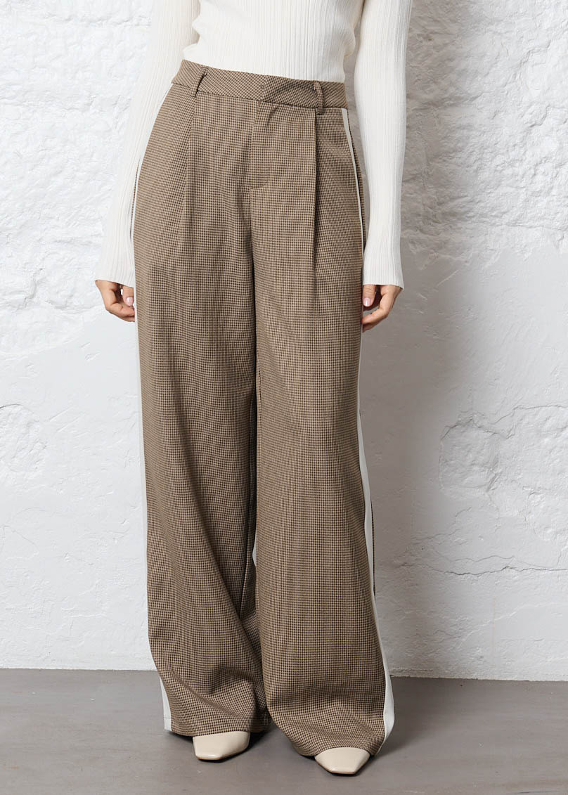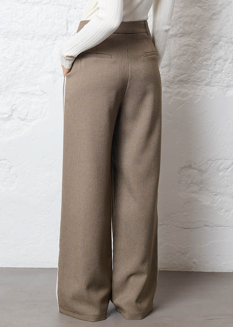 Deze broek is een echte eyecatcher! De klassieke ruit krijgt een trendy touch door de beige strepen aan de zijkant. Super stijlvol en makkelijk te combineren.
