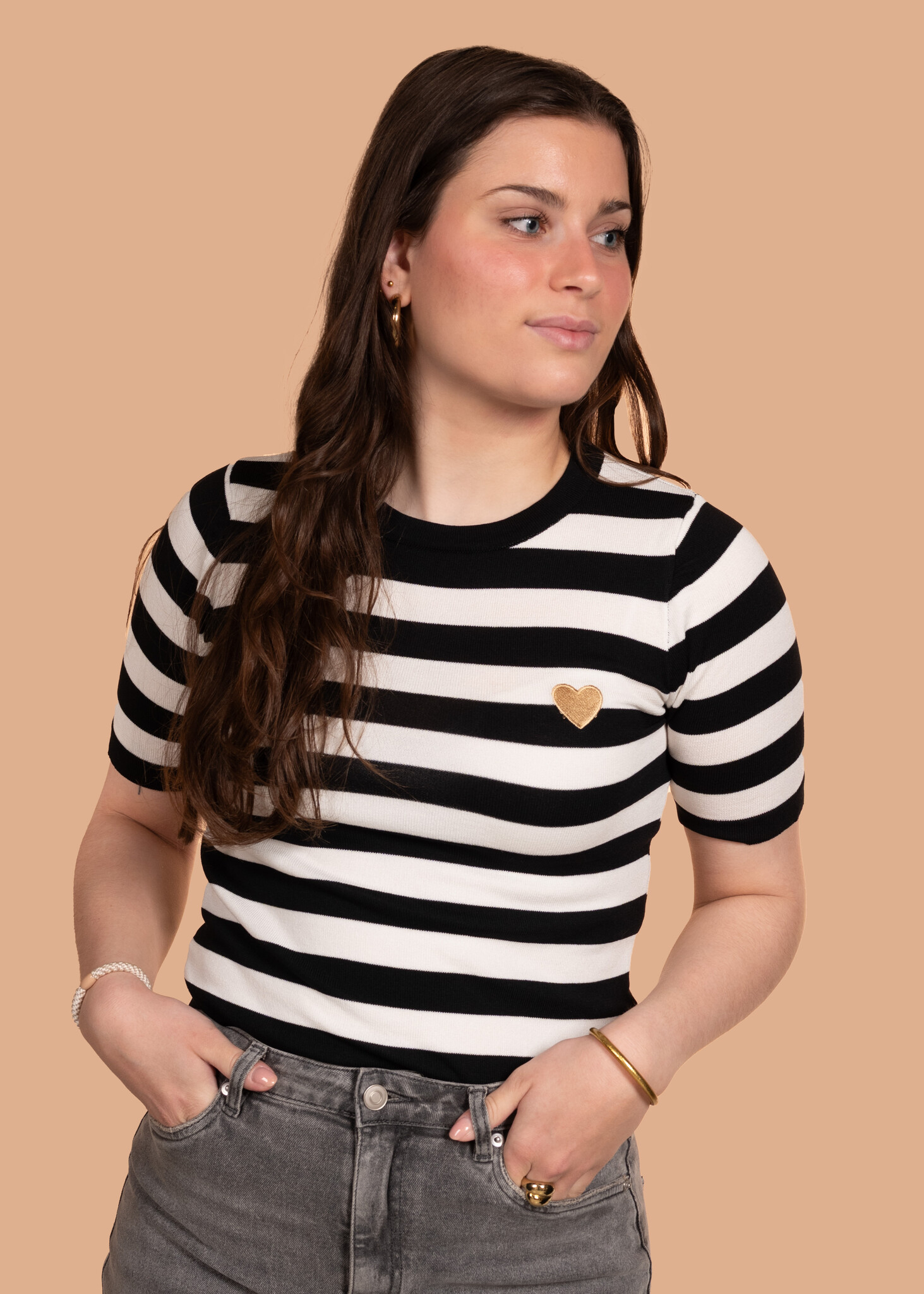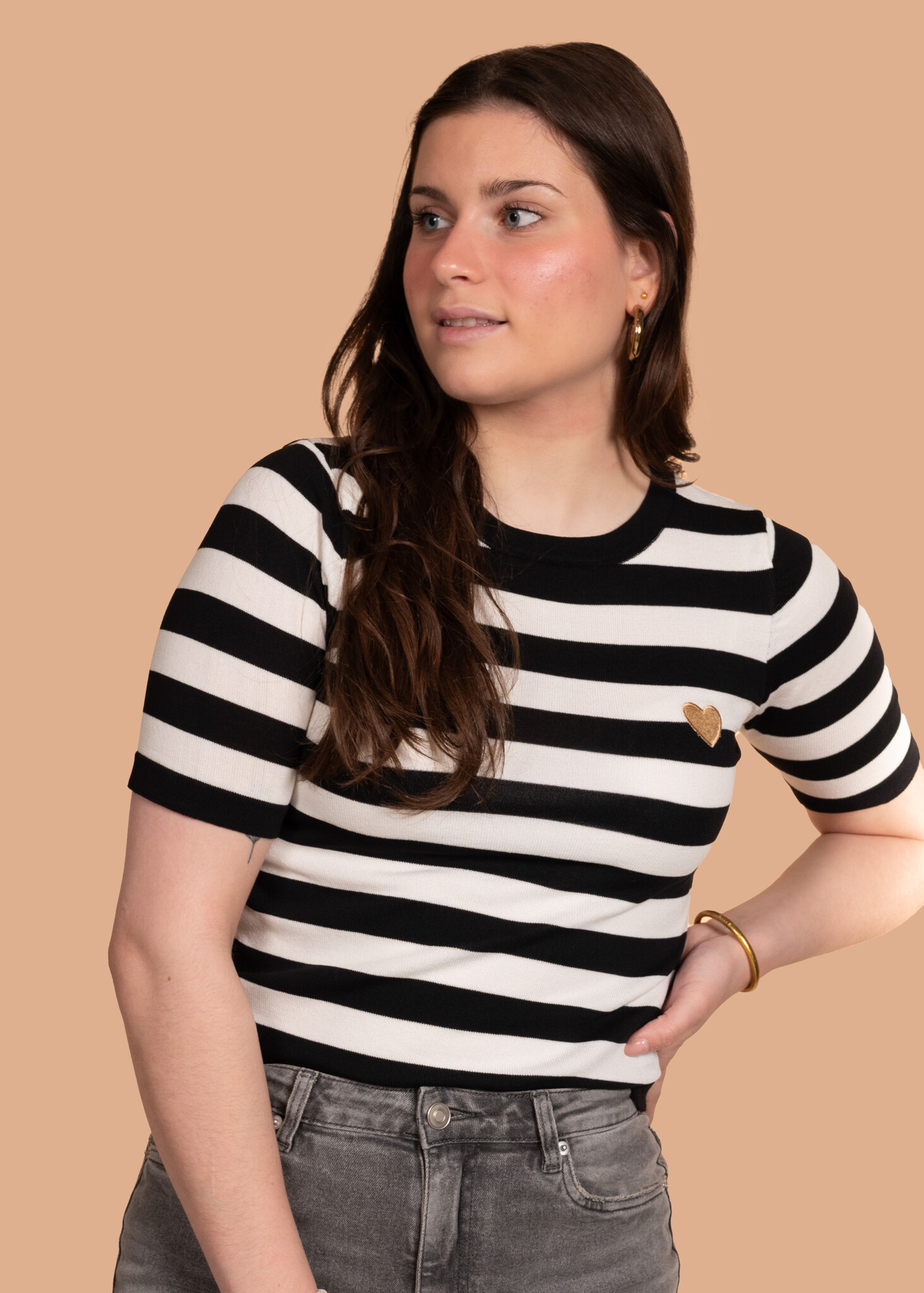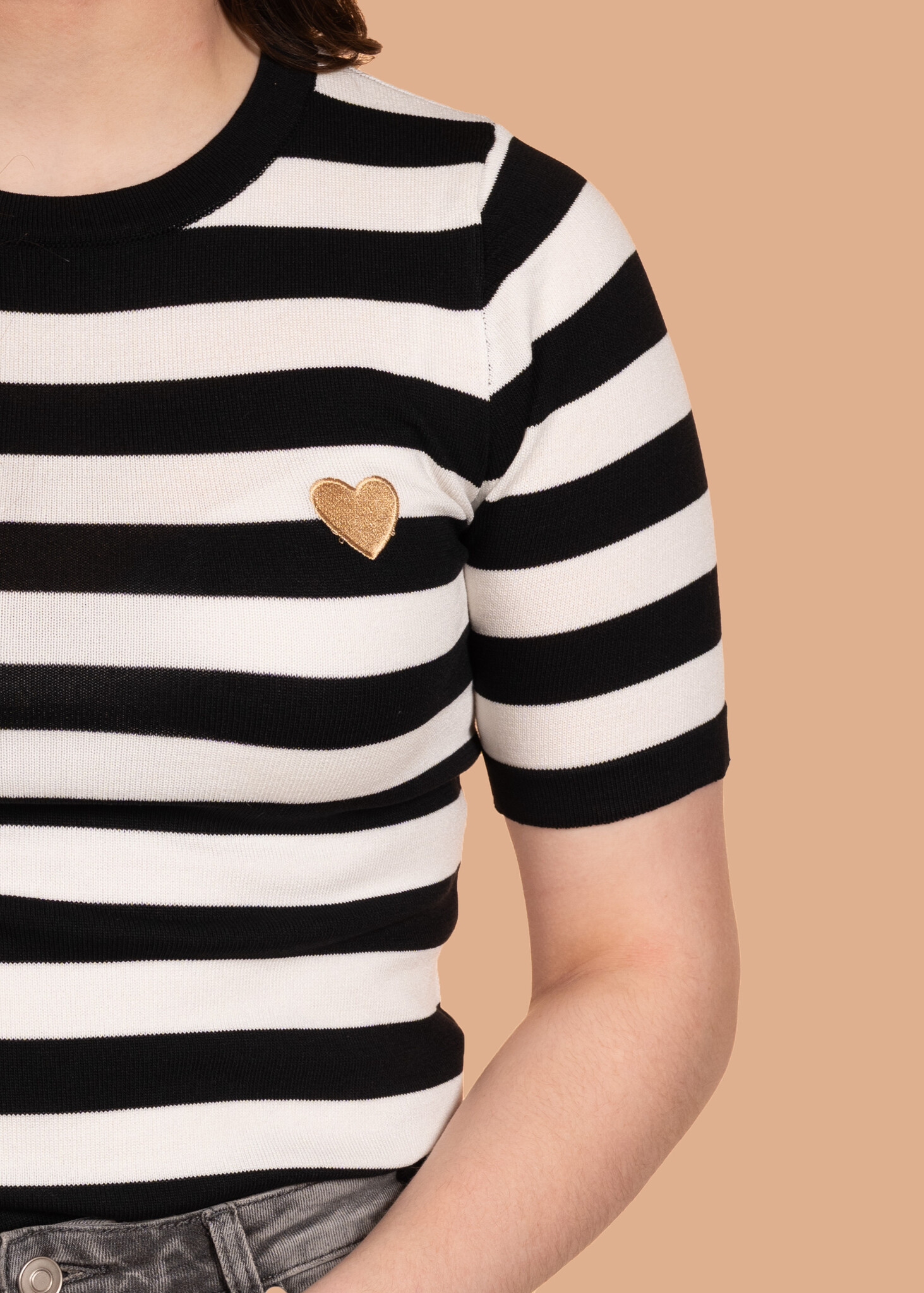 Deze gestreepte top is een echte essential voor in je kledingkast! Met zijn tijdloze zwart-witte strepen en speelse hartje op de borst is hij perfect voor elke gelegenheid.