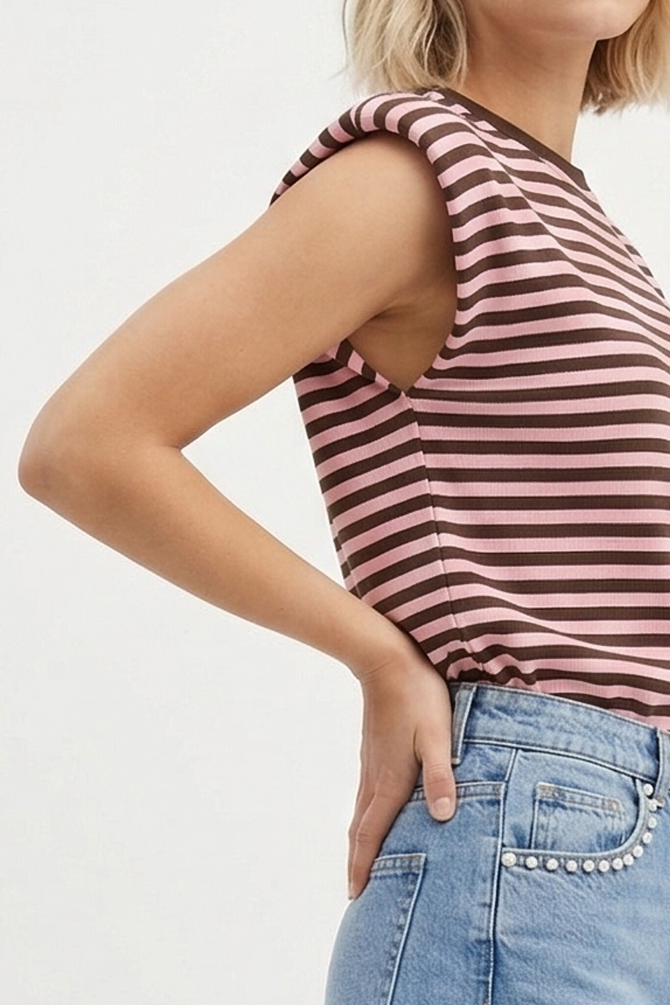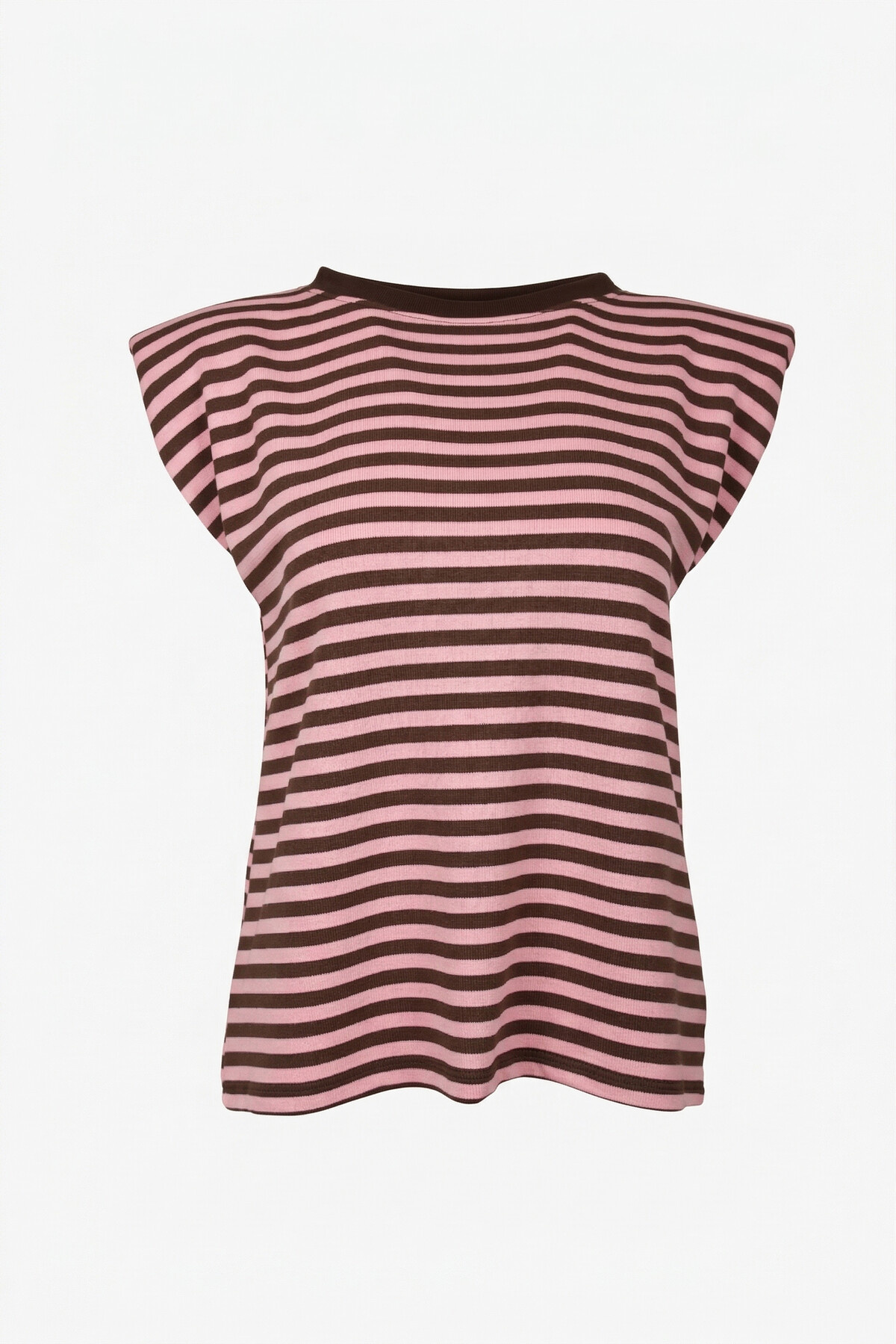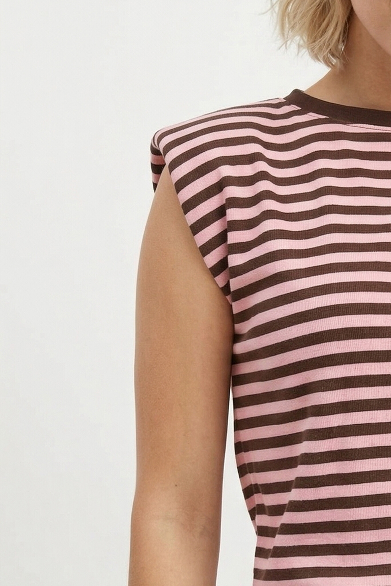 Deze top is echt een musthave voor jouw garderobe! De bruin/roze gestreepte print is super trendy en makkelijk te combineren. De mouwloze fit maakt 'm perfect voor de warmere dagen, maar ook ideaal om te layeren onder een vestje of jasje als het wat koeler is. De subtiele schoudervulling geeft je outfit net dat beetje extra flair en zorgt voor een fashionable look.