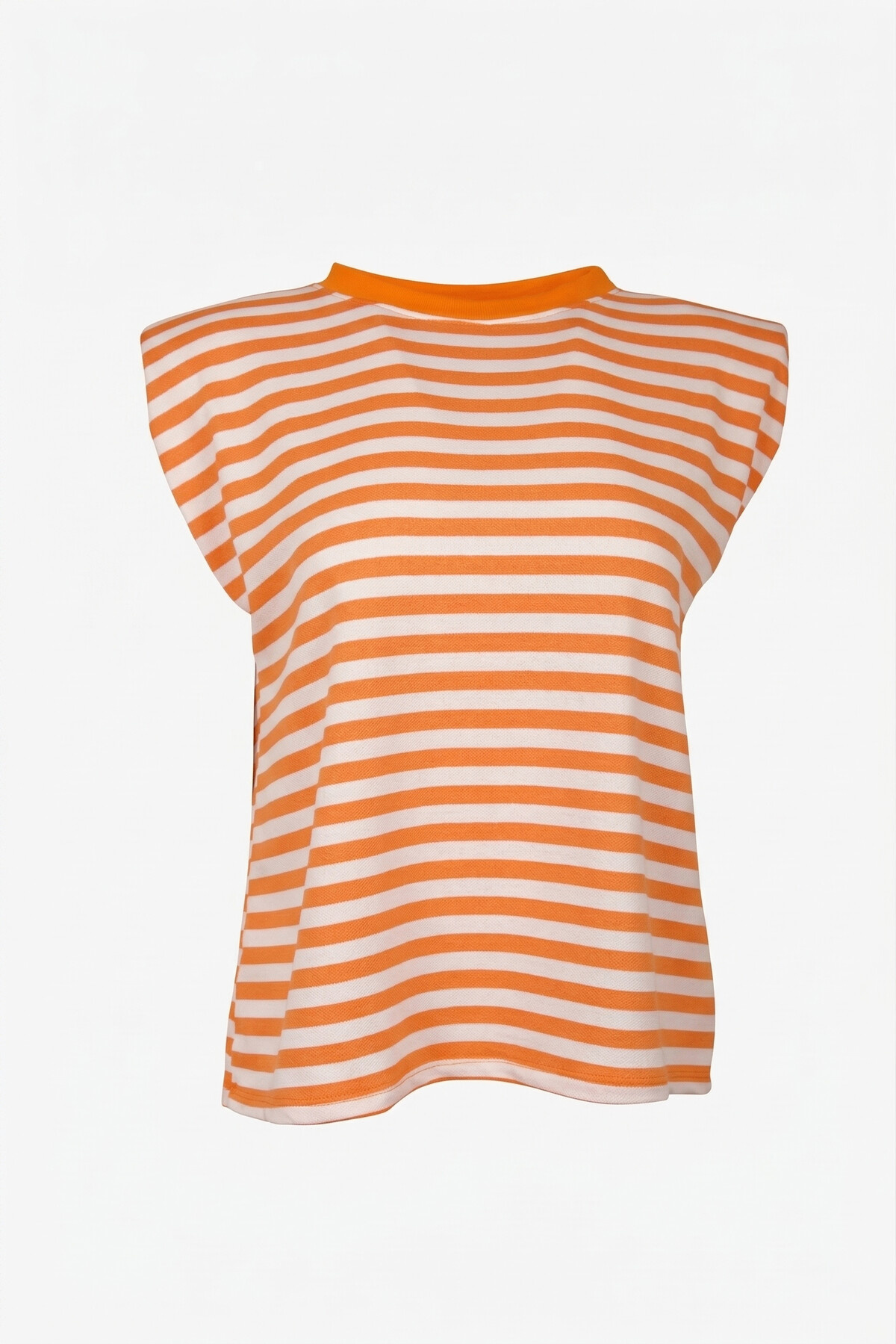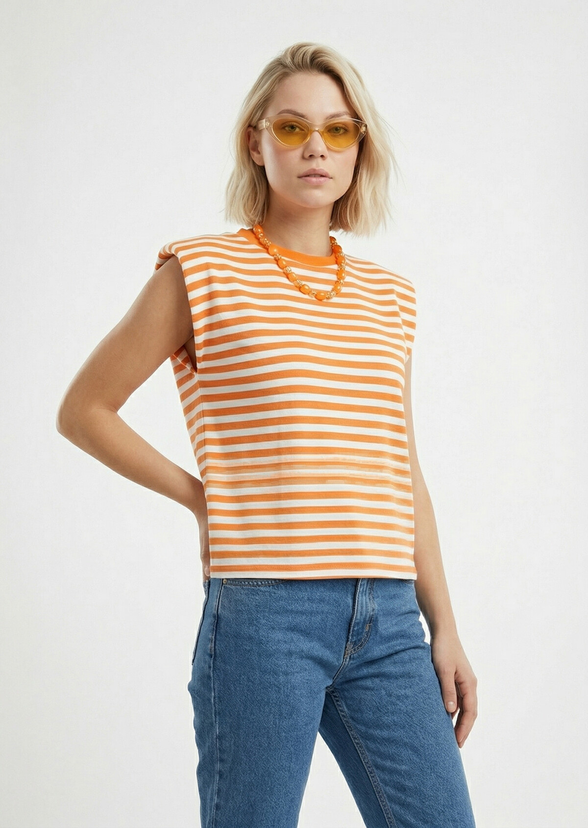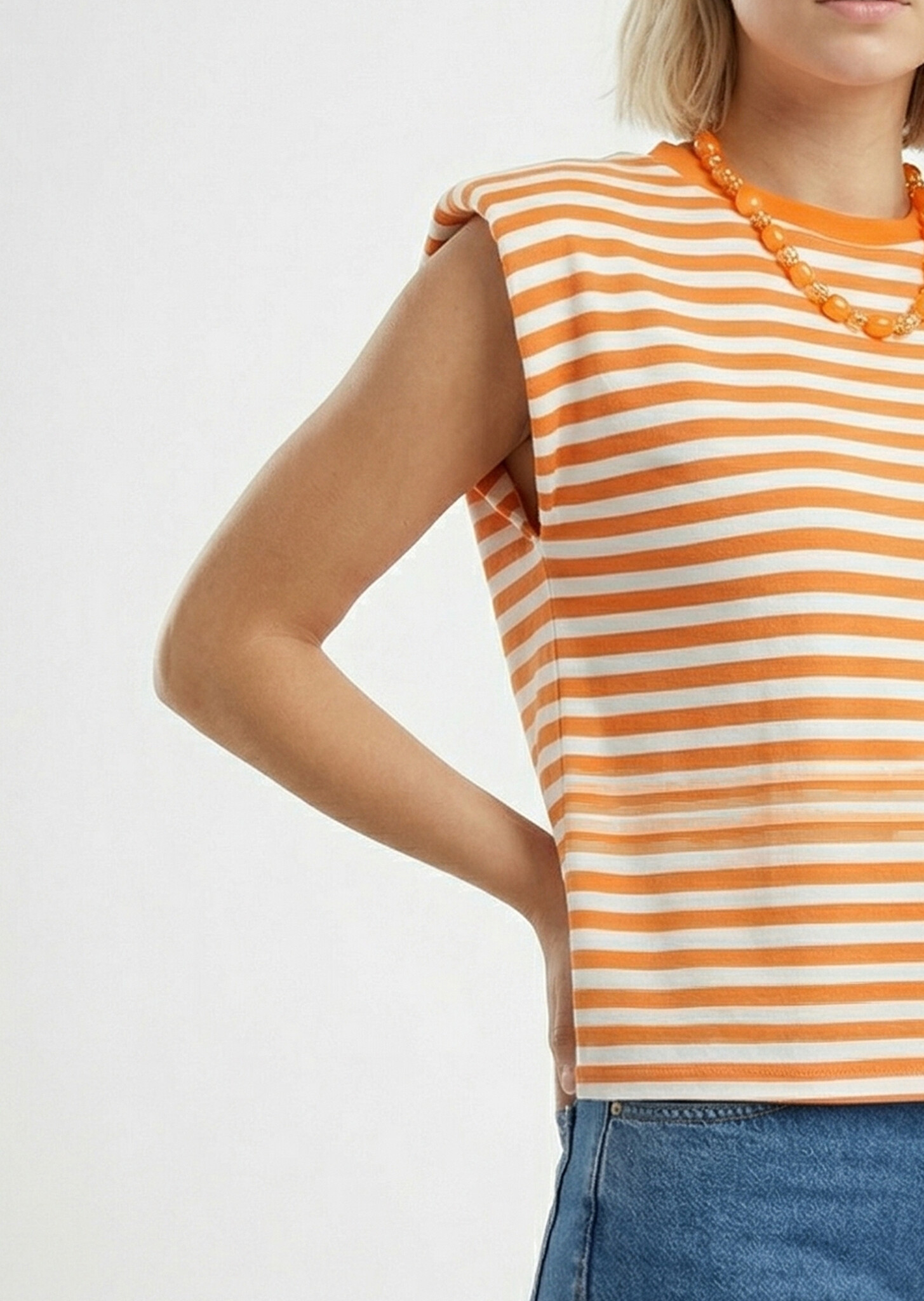 Deze mouwloze top is perfect voor zonnige dagen en warme avonden. De oranje/wit gestreepte print geeft je outfit een vrolijke touch, terwijl de subtiele schoudervulling zorgt voor een fashionable silhouet. Een echte must-have voor jouw garderobe!