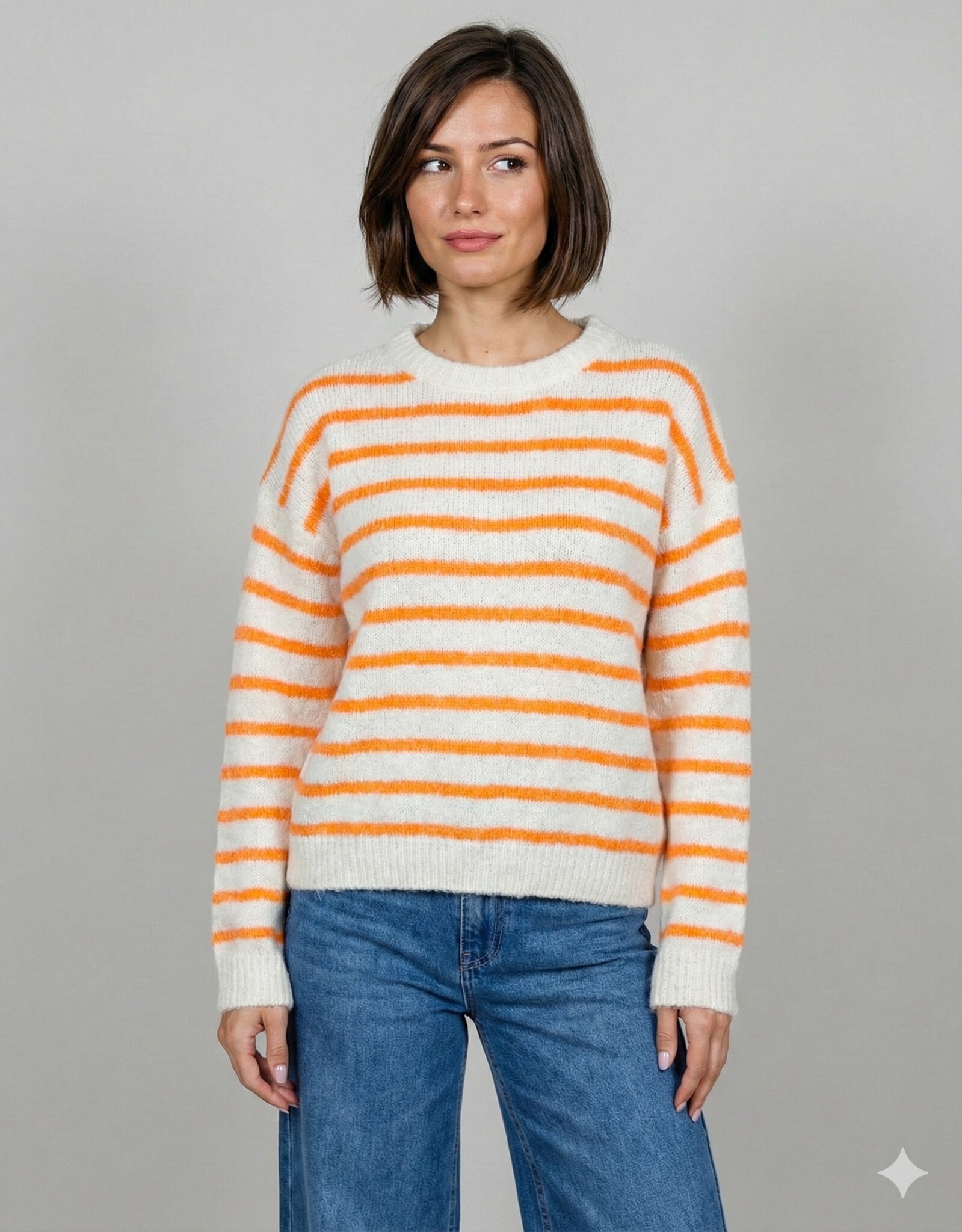 Begin je dag goed met deze vrolijk gekleurde trui. De combinatie van fris ecru met heldere oranje strepen geeft je direct een energieke uitstraling. Oranje is dé trendkl