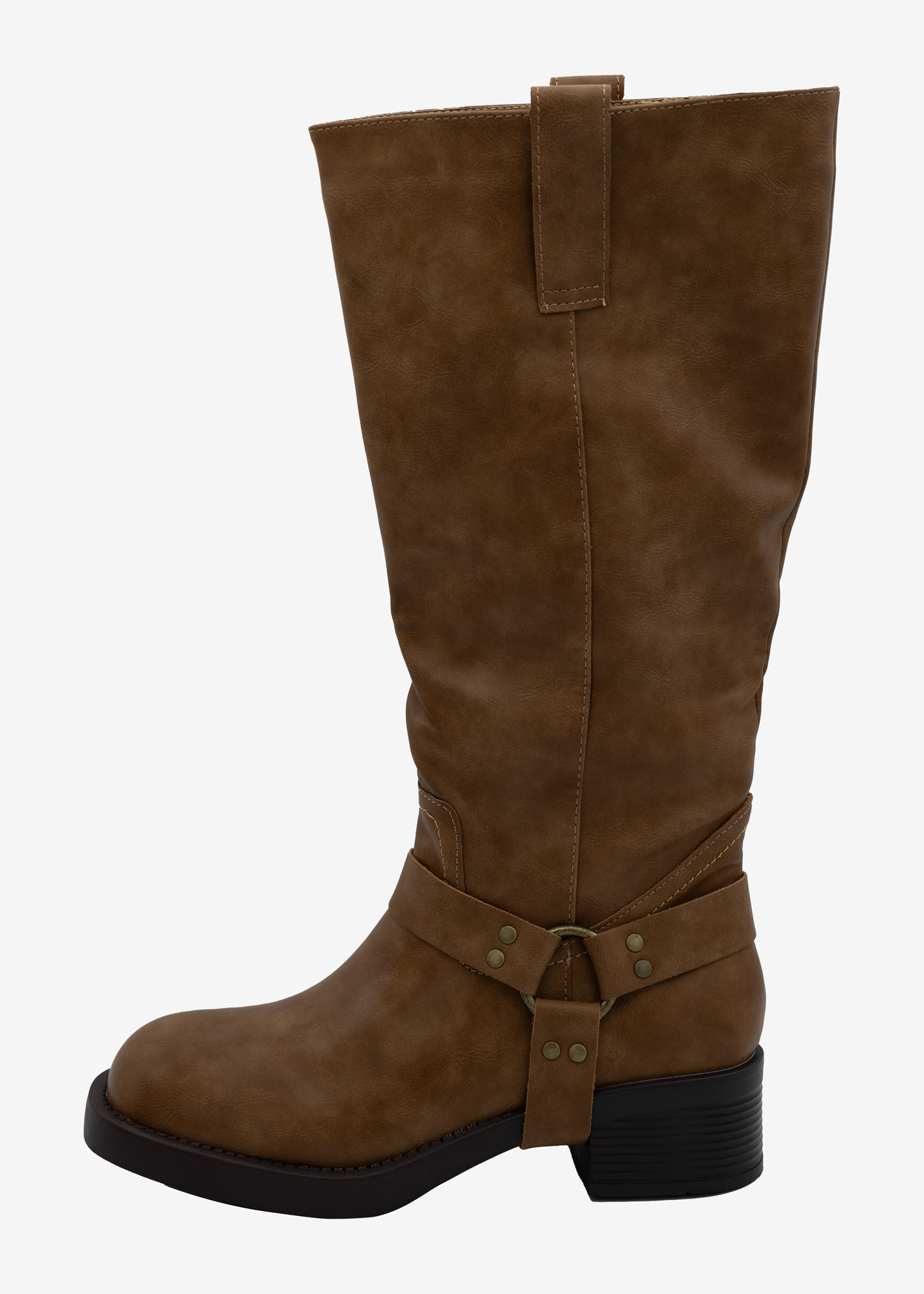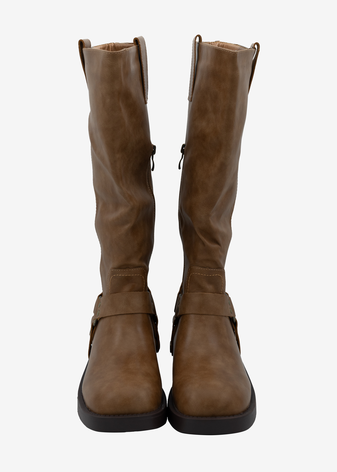 Deze hoge stoere laarzen zijn een echte eyecatcher met hun opvallende gespen. Ze geven je outfit direct een edgy touch, zonder in te leveren op stijl. De beige kleur is makkelijk te combineren en past perfect bij de herfsttinten.