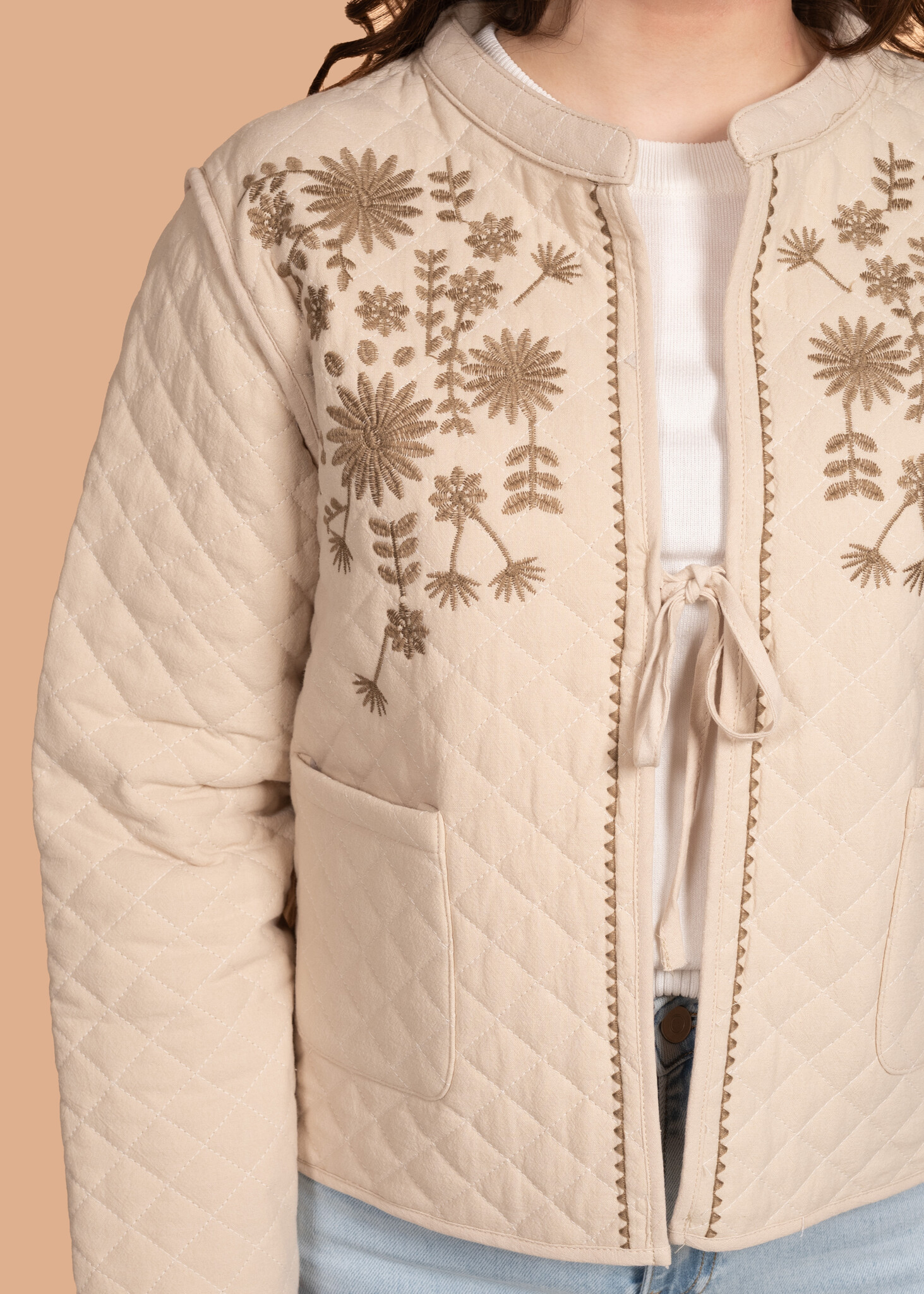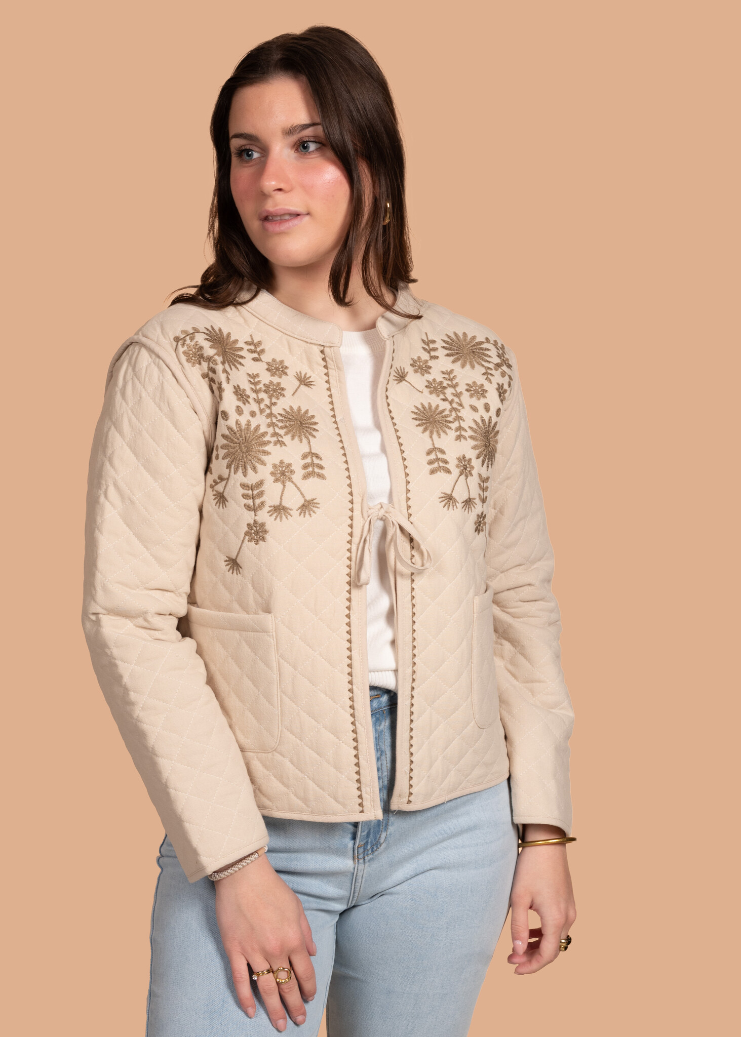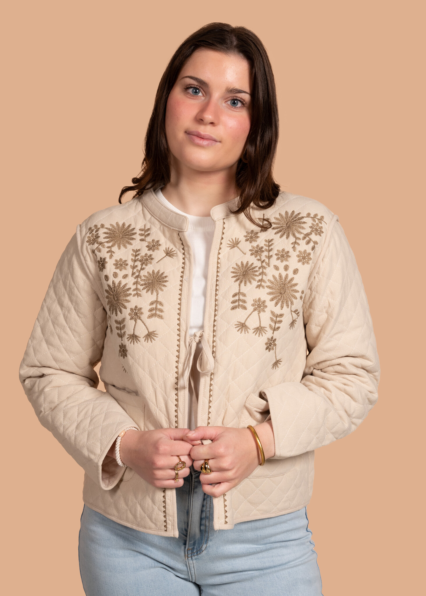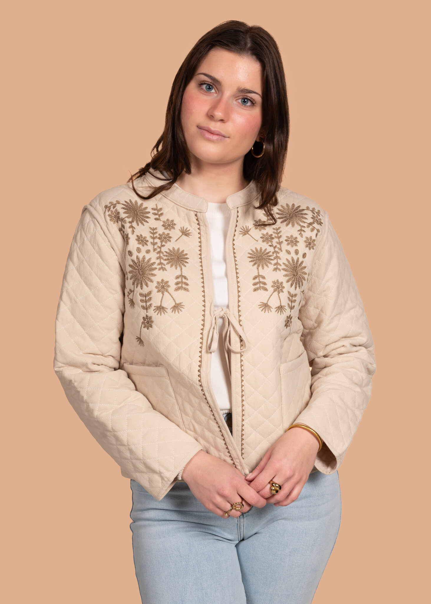 Deze beige katoenen jacket is een echte eyecatcher met z'n prachtige print. De subtiele details geven 'm net dat beetje extra, perfect voor meiden die van een beetje boho vibes houden!