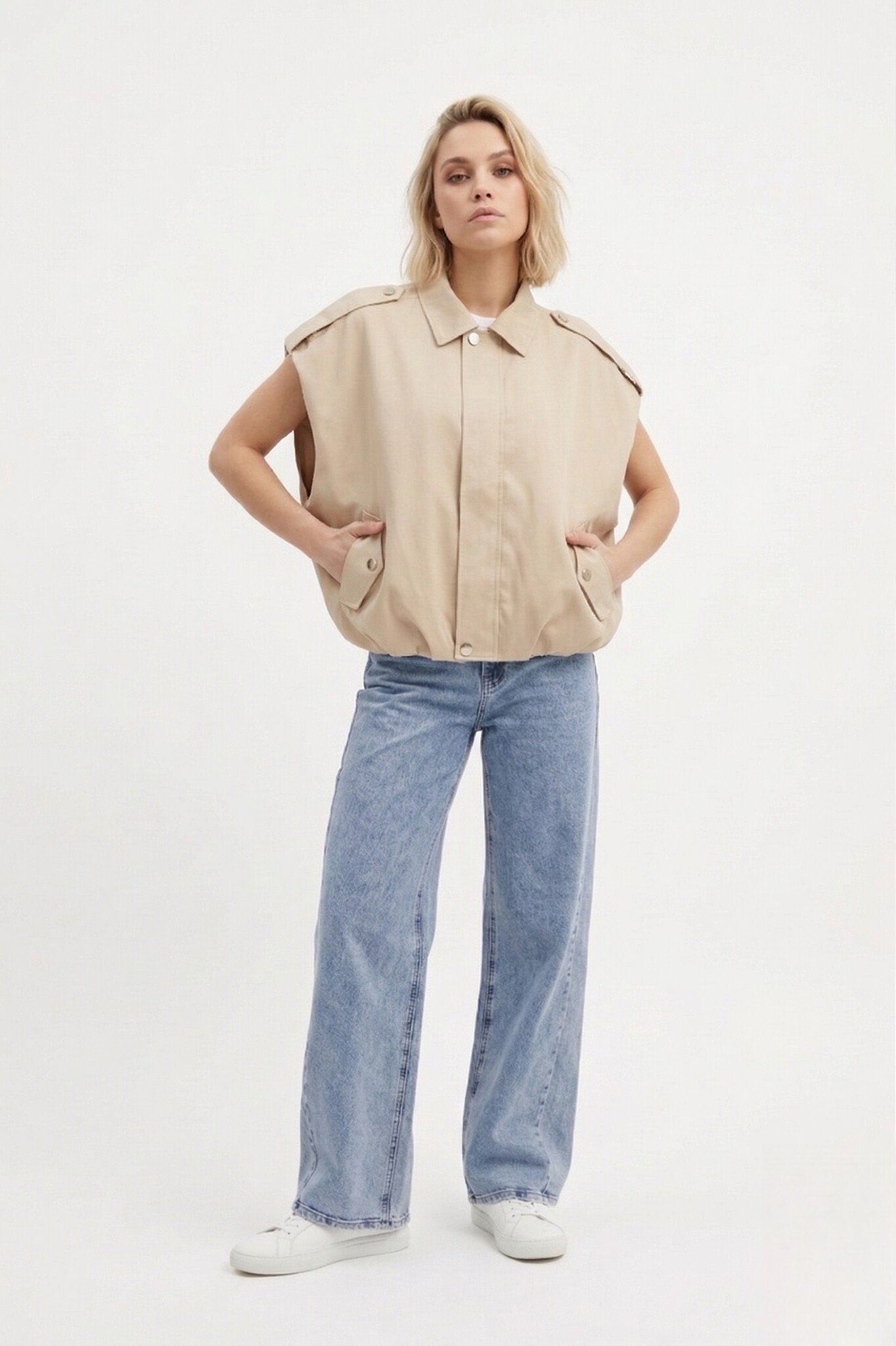 Deze stoere gilet is de perfecte toevoeging aan je garderobe als je op zoek bent naar een edgy, maar toch stijlvolle look. De gilet beige met rits is super veelzijdig en geeft elke outfit een upgrade. De kleur is makkelijk te combineren en past bij vrijwel alles in je kledingkast.