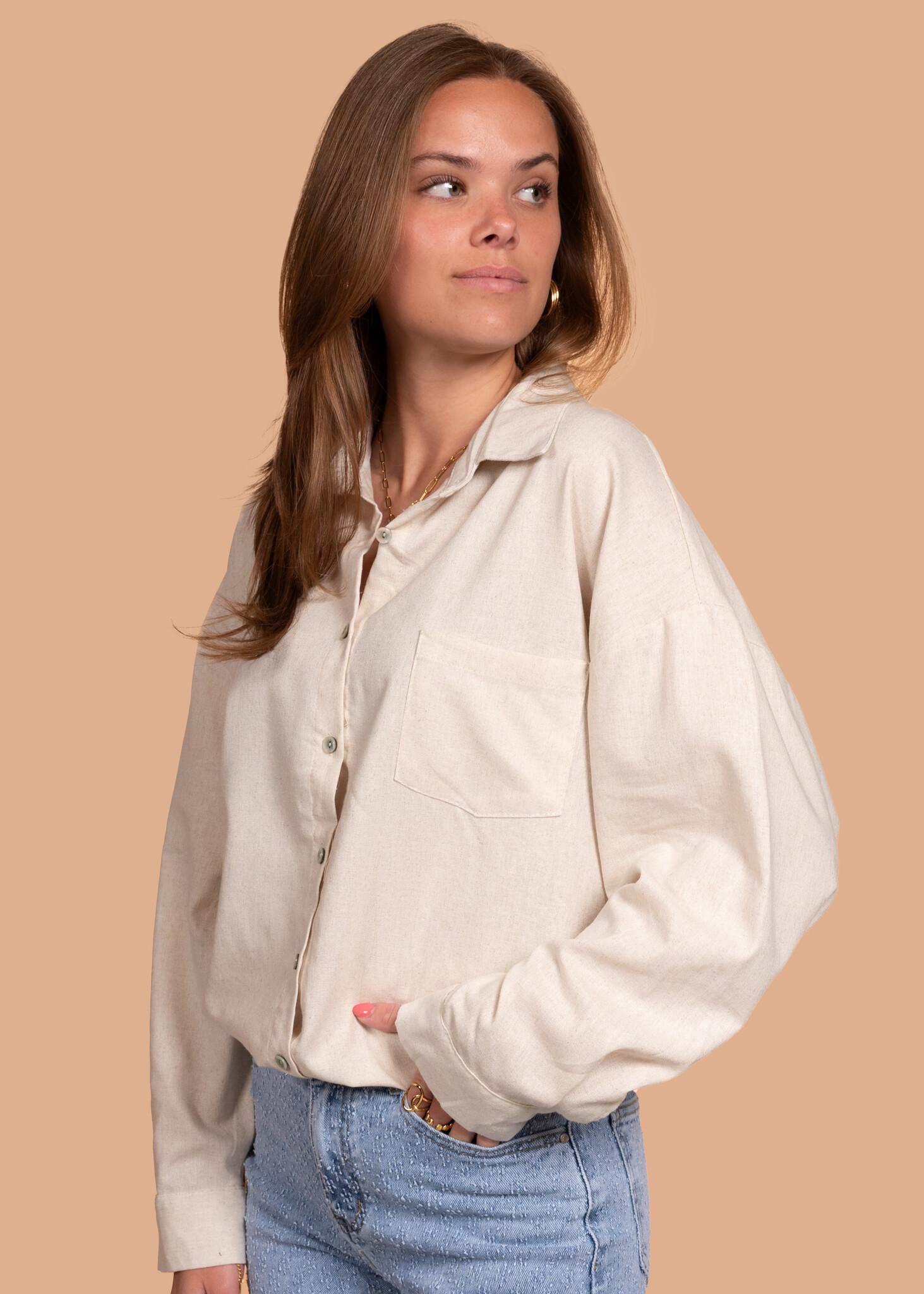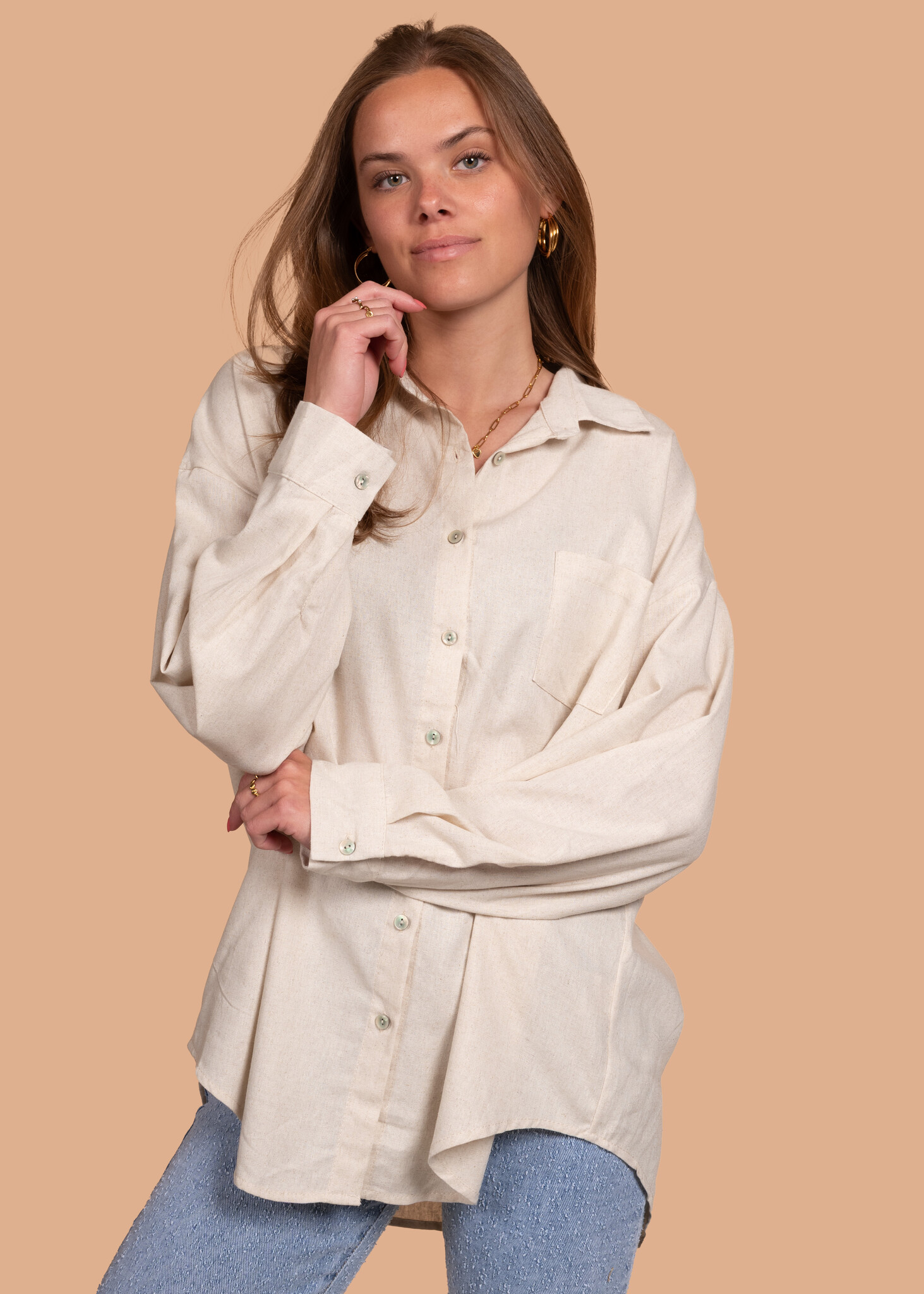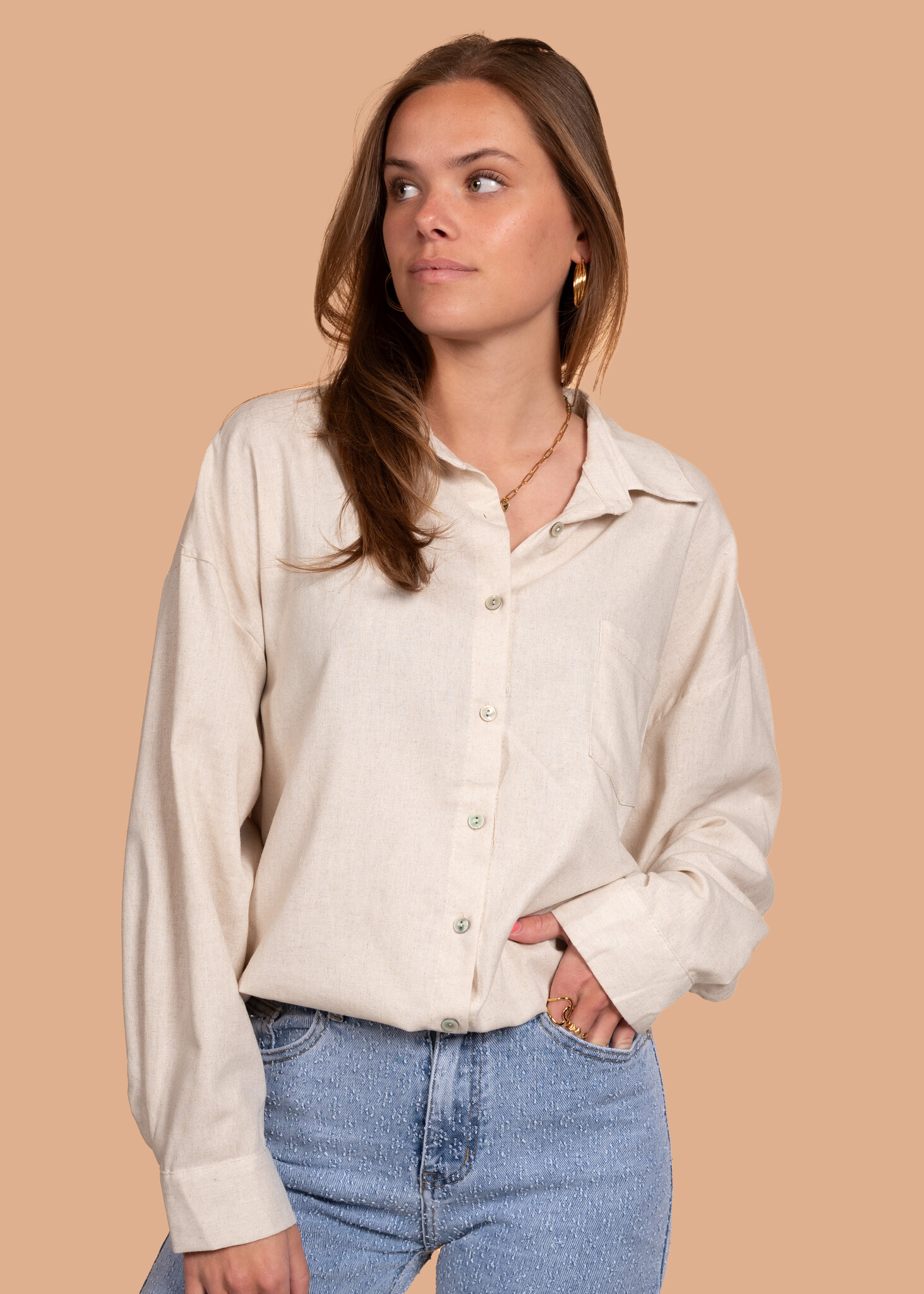 Deze blouse, gemaakt van een comfortabele stof met linnenlook, is ideaal voor warme zomerdagen. De blouse heeft een casual, oversized pasvorm en is perfect te combineren met zowel een jeans als een rokje.