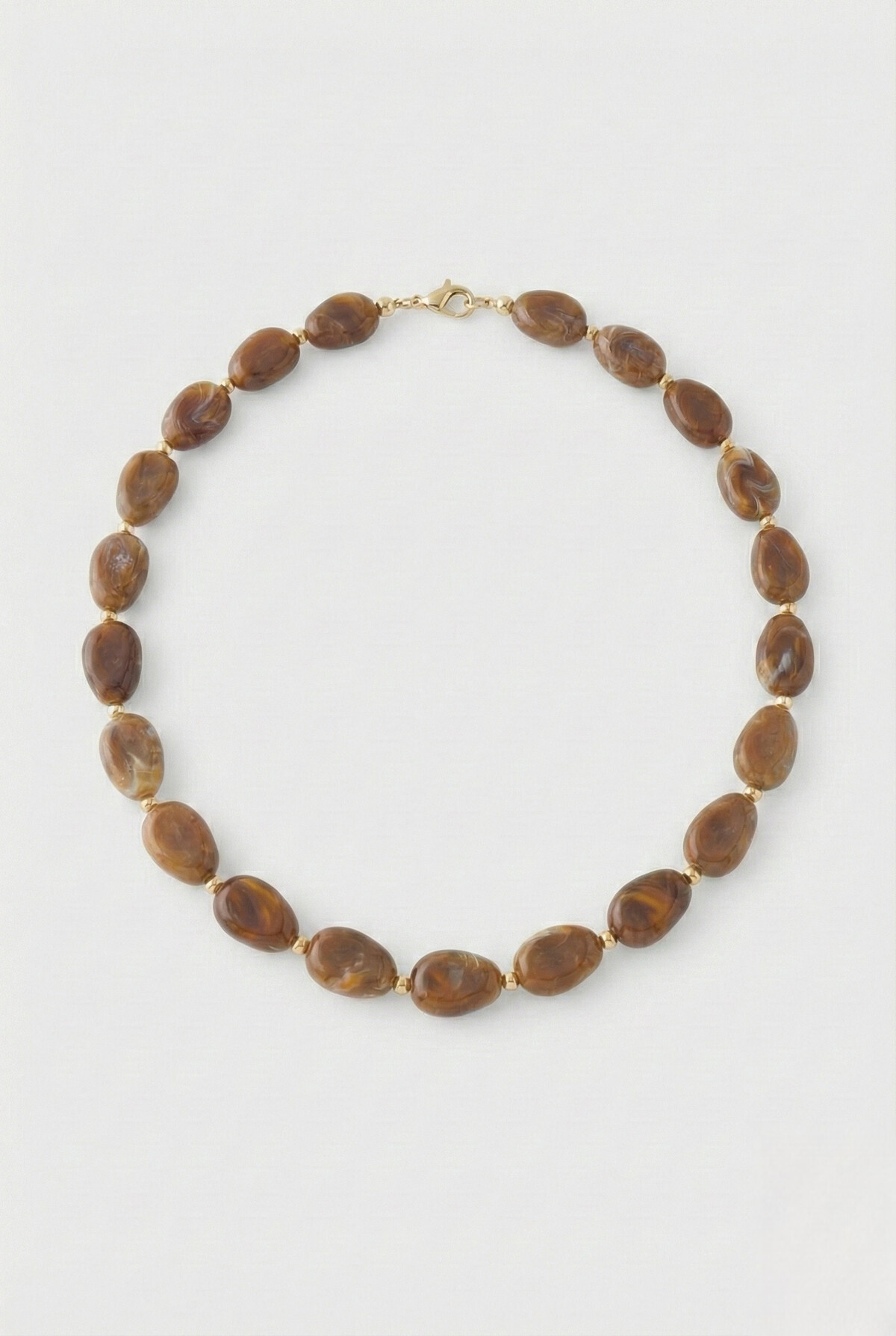 Ben jij ook zo fan van de 'Latte' trend? Dan is deze ketting echt iets voor jou. De ketting bestaat uit grove, ovale kralen met een prachtige diepbruine marmer-look. De gouden tussenstukjes geven het geheel een chique glans.
