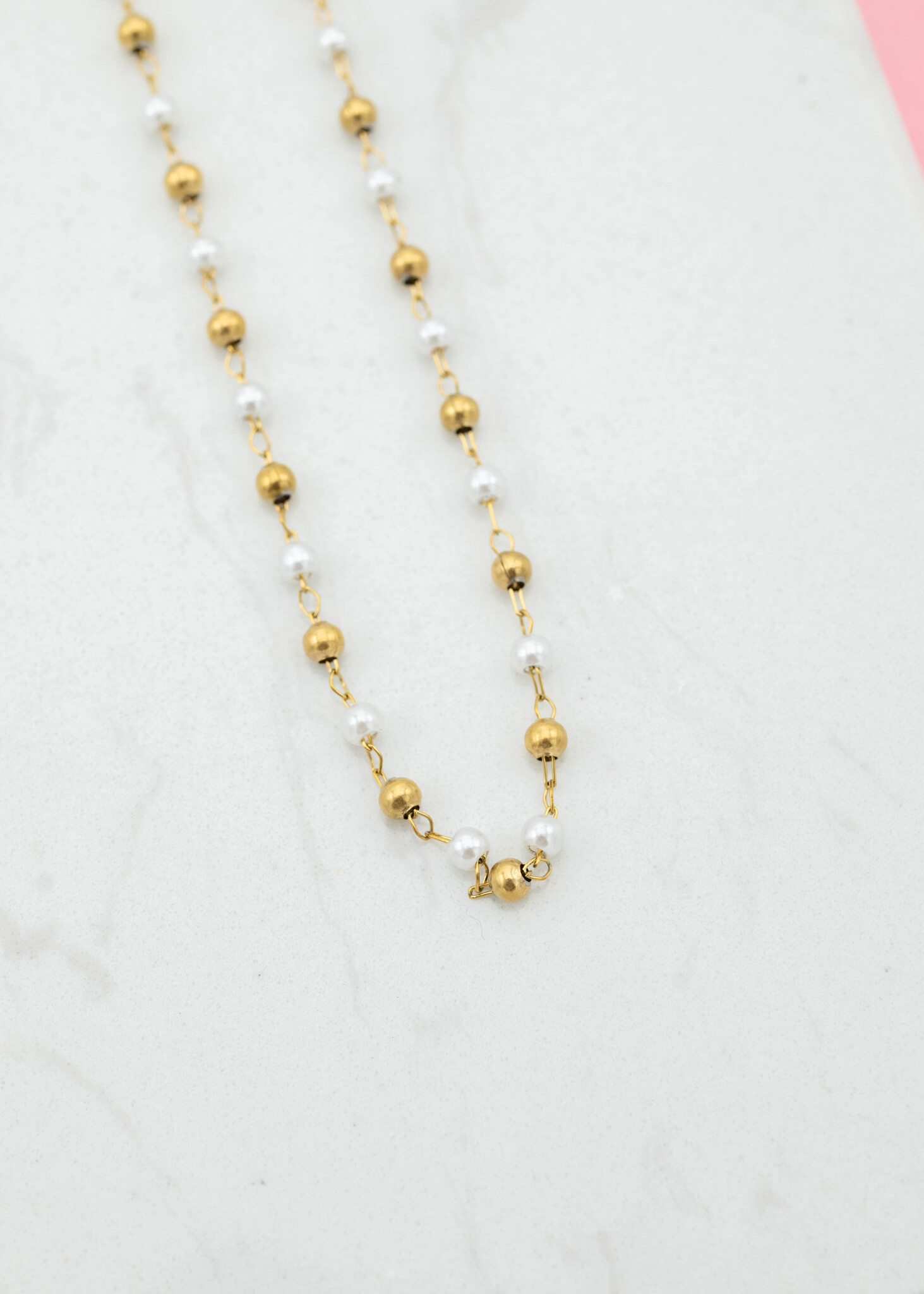 Deze prachtige ketting met wit en gouden kralen is een echte eyecatcher! De afwisseling van de witte pareltjes en gouden details geeft de ketting een elegante en trendy uitstraling.