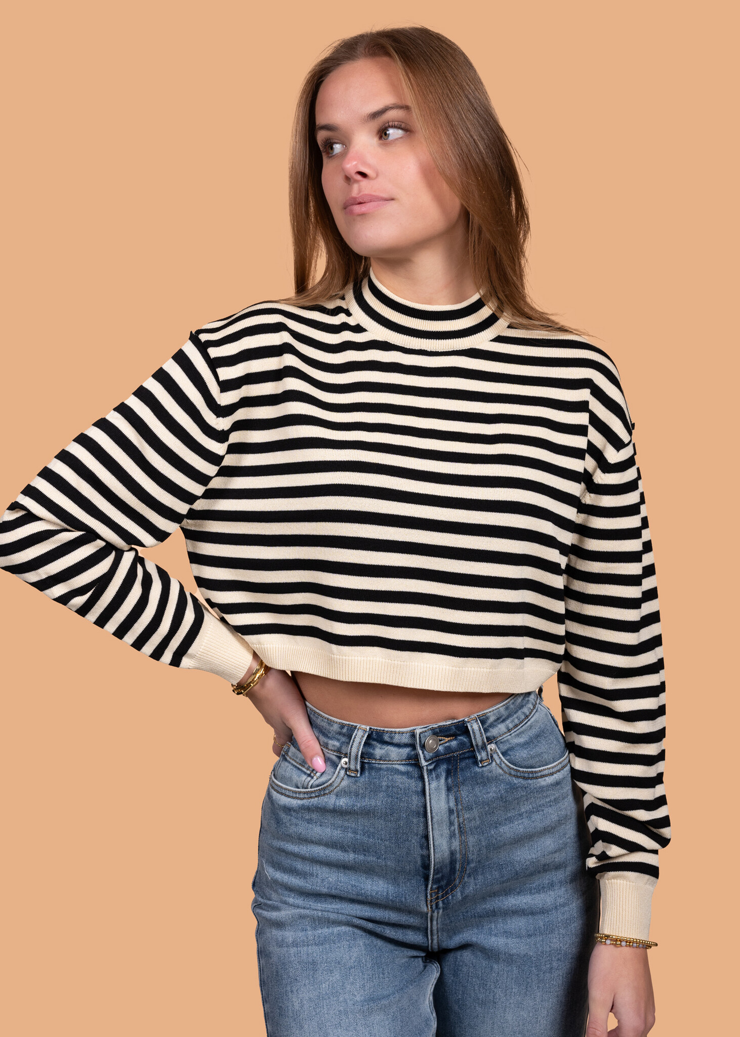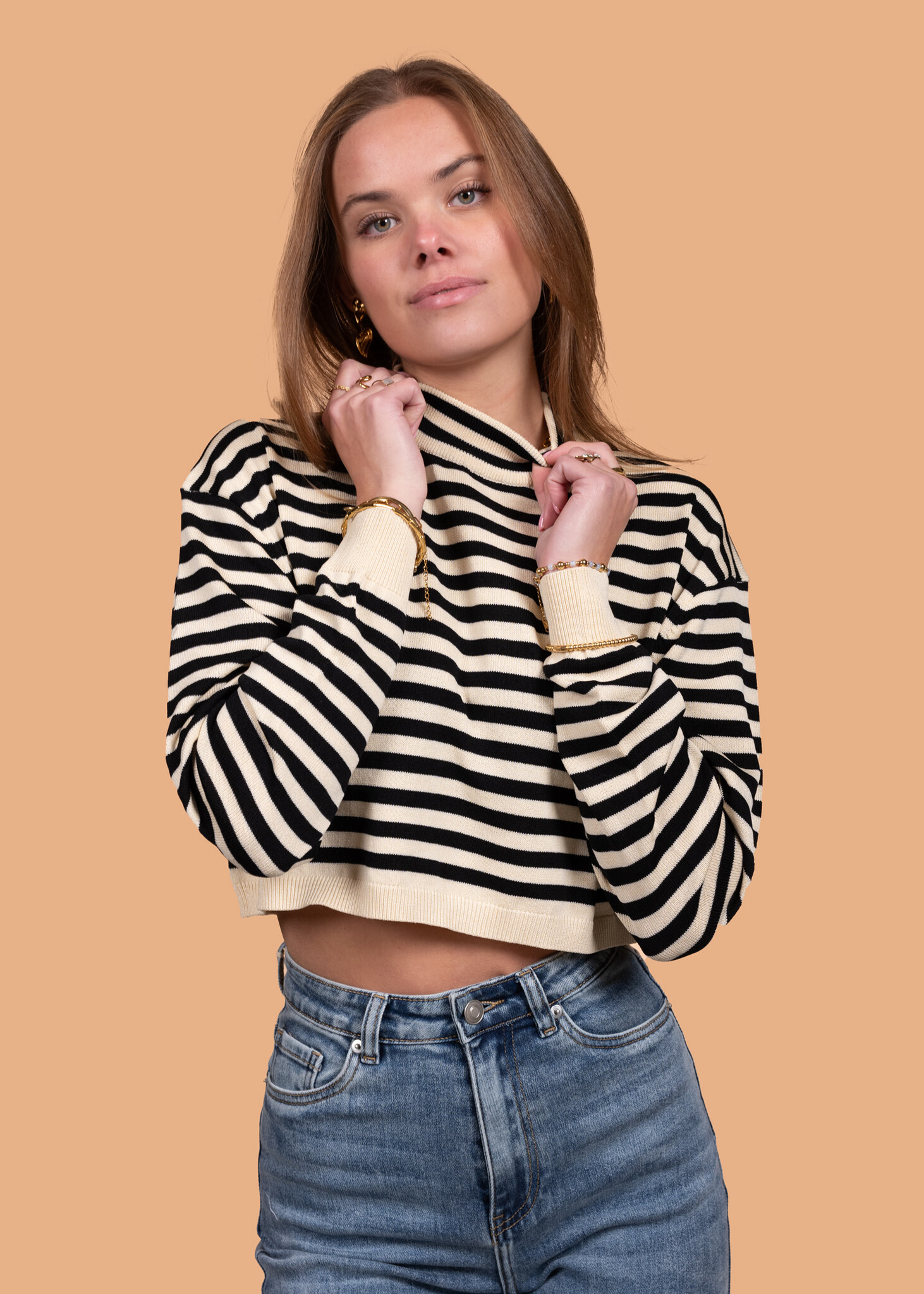 Op zoek naar een comfy en stylish item om je garderobe mee op te fleuren? Check deze zwart/wit gestreepte trui! De cropped fit en col geven ‘m een trendy touch, terwijl de zachte stof zorgt voor ultiem draagcomfort.