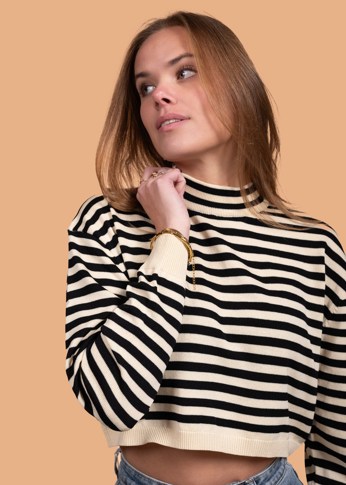 Deze korte gestreepte trui is een echte allrounder. Draag ‘m casual met een high waisted jeans en sneakers voor een relaxte look, of dress ‘m up met een mooie pantalon en hakken voor een avondje uit.