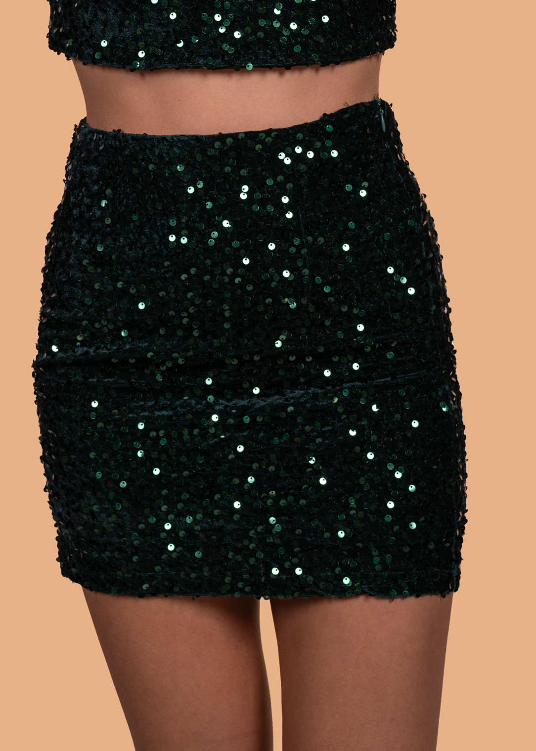 Klaar om te stralen? Deze pailletten rok is een echte eyecatcher! De glinsterende pailletten geven je instant een feestelijke look, terwijl de korte groene rok voor een flirty touch zorgt.