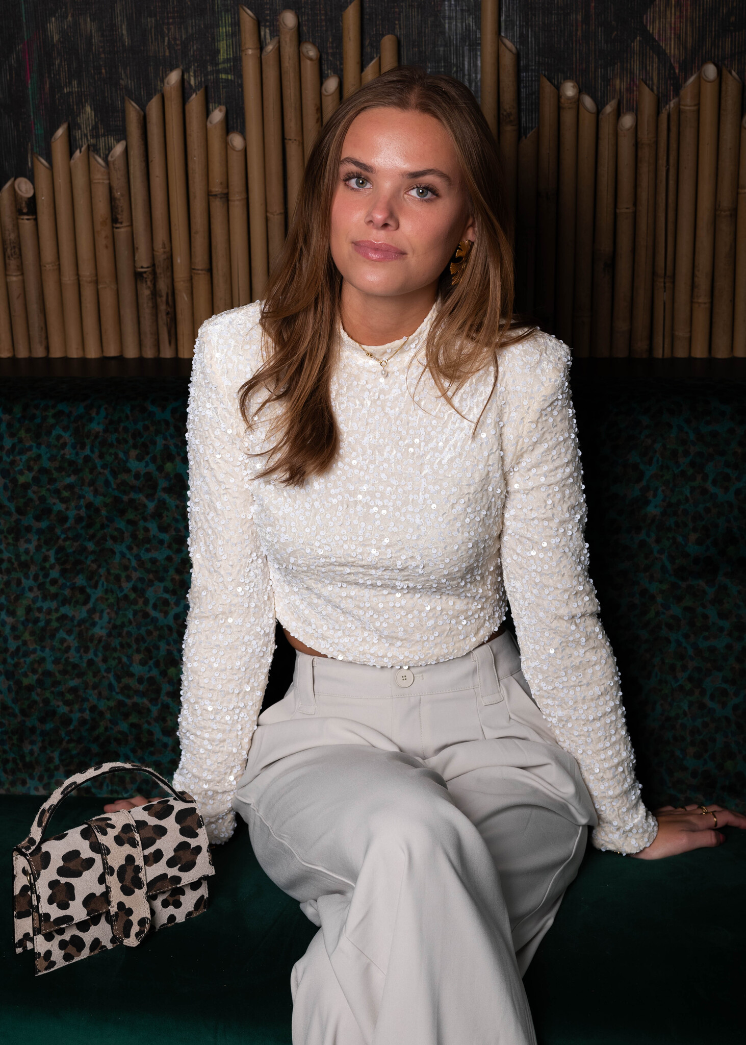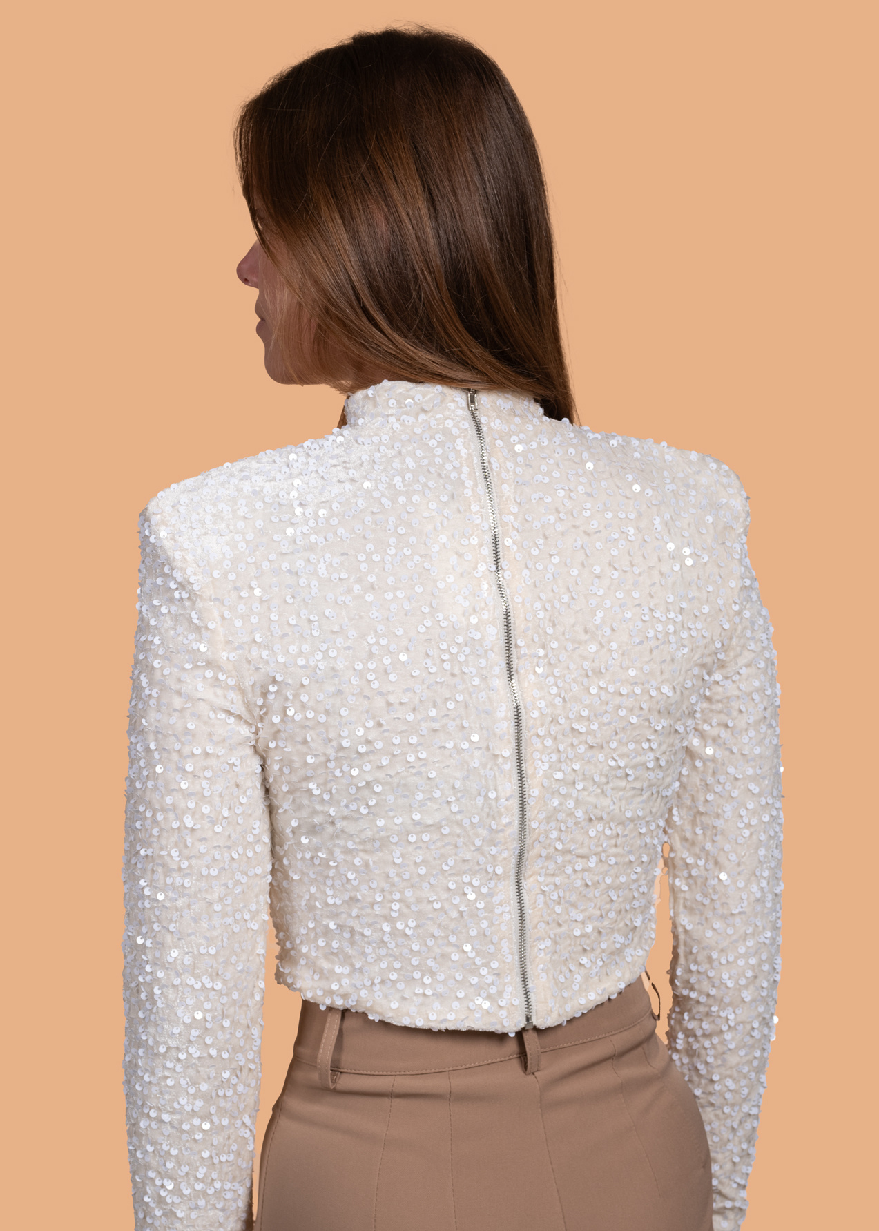 Deze korte witte top is bezet met kleine pailletten die zorgen voor een subtiele, maar feestelijke look. Perfect voor een avondje uit, een feestje of gewoon om je dagelijkse outfit wat op te fleuren.