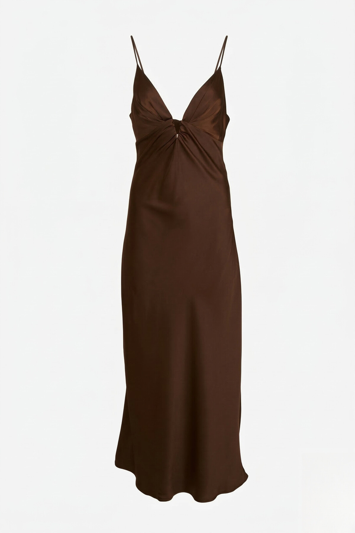 Steel de show met deze lange classy jurk in koffiebruin! De satijn-look stof geeft een luxe uitstraling. Perfect voor een avondje uit of een speciale gelegenheid. Voel je fabulous in deze jurk!