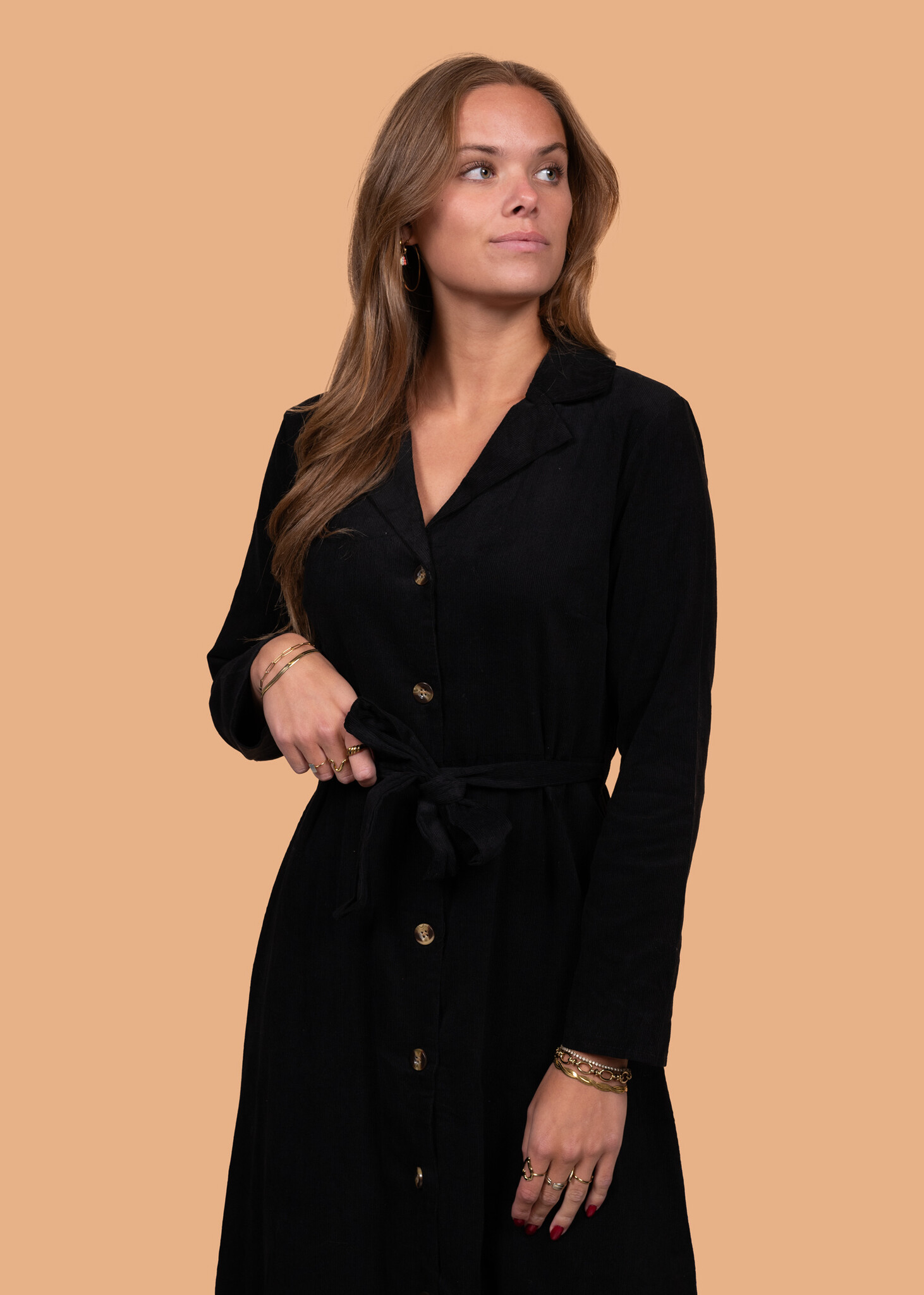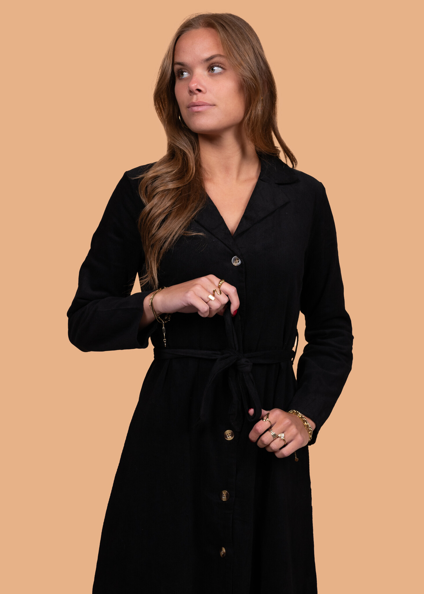 Deze lange zwarte jurk is een echte essential voor in je garderobe! De jurk is gemaakt van corduroy, wat hem een supertrendy look geeft. Door de knopen aan de voorkant en het strikje in de taille creëer je een flatterende pasvorm.