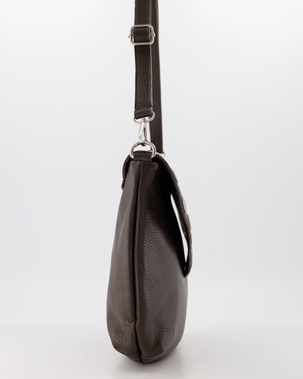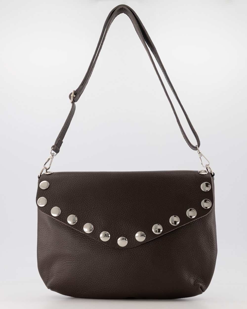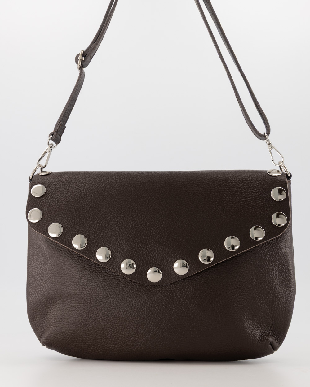 Mag het net even iets anders zijn? Maak kennis met de Juli: een prachtige leren schoudertas die klassiek donkerbruin combineert met een stoer randje. De opvallende zilverkleurige studs langs de V-vormige flap maken van deze tas een echte eyecatcher, zonder dat het 'te veel' wordt.
