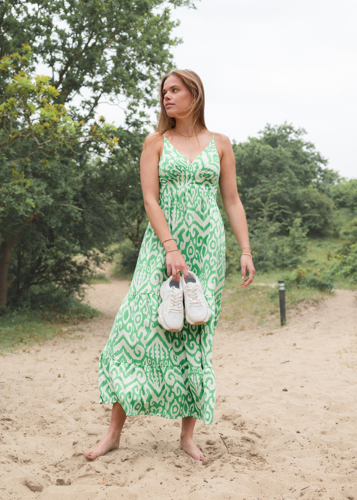 Deze maxi jurk met print is een echte musthave voor de zomer! De vrolijke groene kleur en het zwierige model maken hem perfect voor warme dagen.