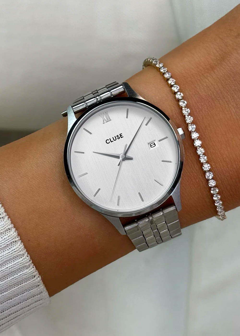 Op zoek naar een stijlvolle accessoire die je outfit helemaal afmaakt? Dit prachtige Cluse horloge is de perfecte mix van elegantie en minimalisme. Met zijn strakke zilveren design en subtiele datumaanduiding is dit horloge een echte eyecatcher aan je pols.